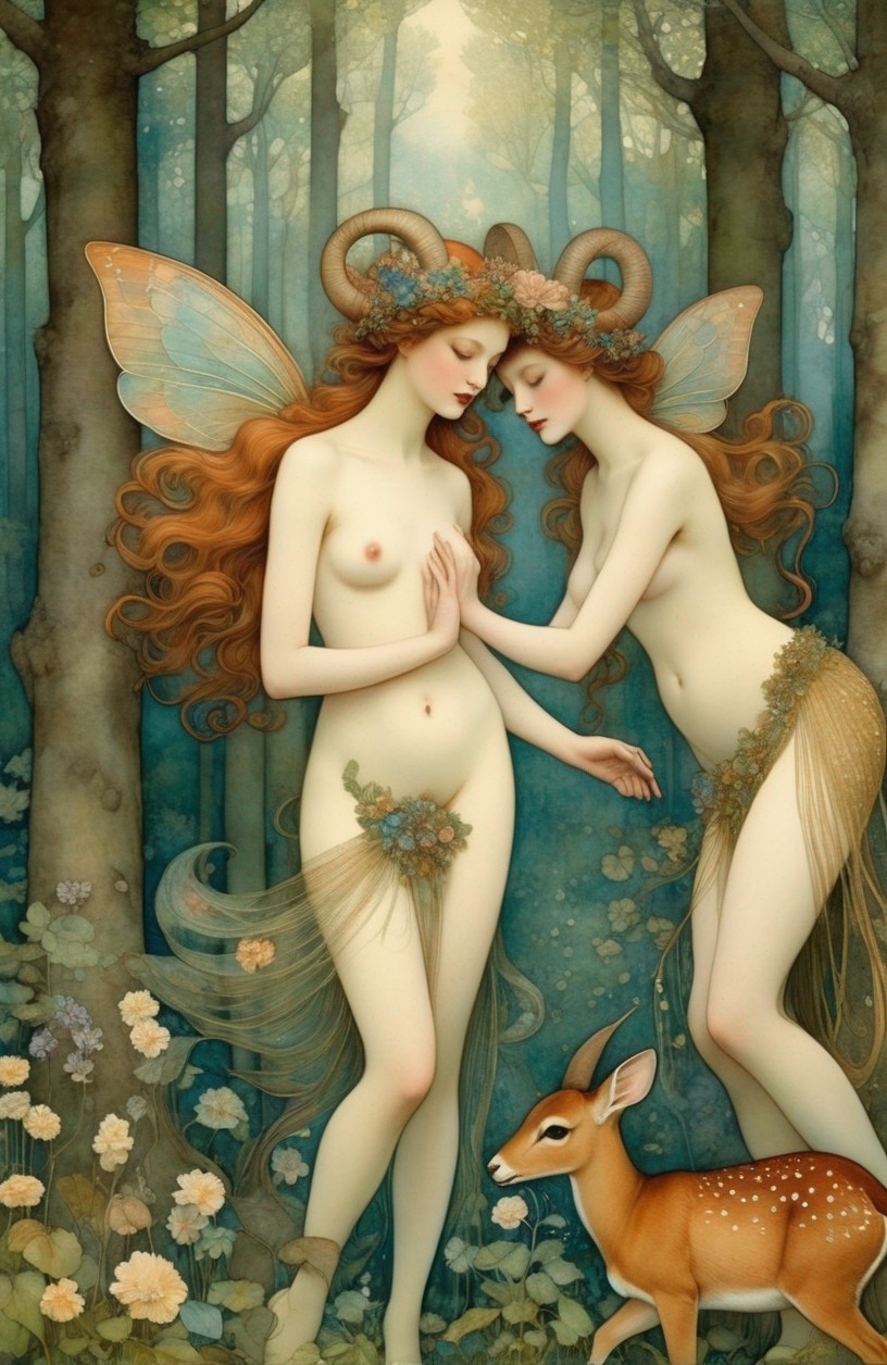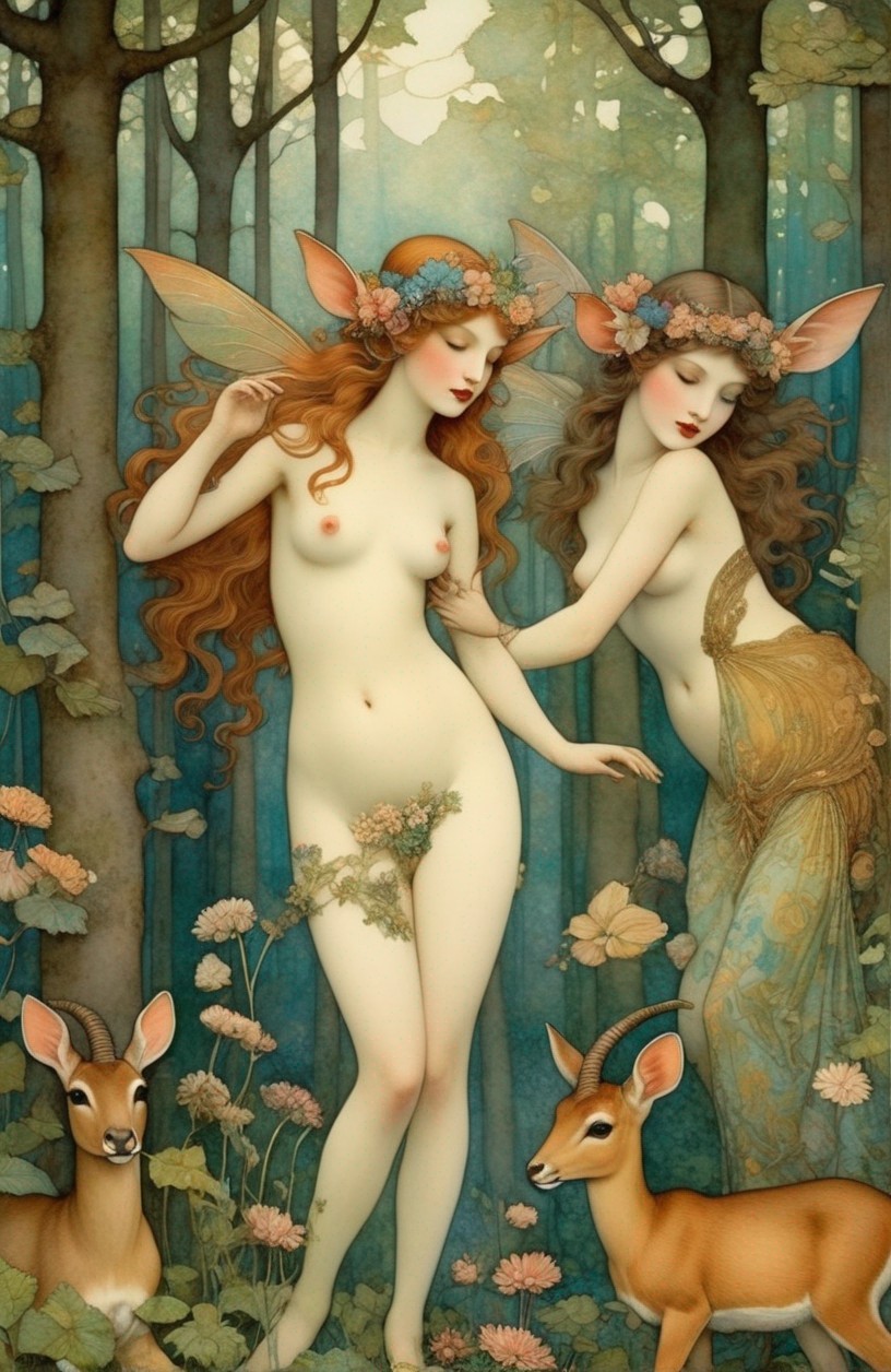 Prompt: Beautiful fauns and nymphs wearing gowns of flowers playing in a beautiful forest. Iridescent watercolor and ink By Jamie Heiden, Daniel Merriam, Paul Klee, Karol Bak, Dee Nickerson, extremely detailed, high definition, crisp quality, ultra detailed background art nouveau