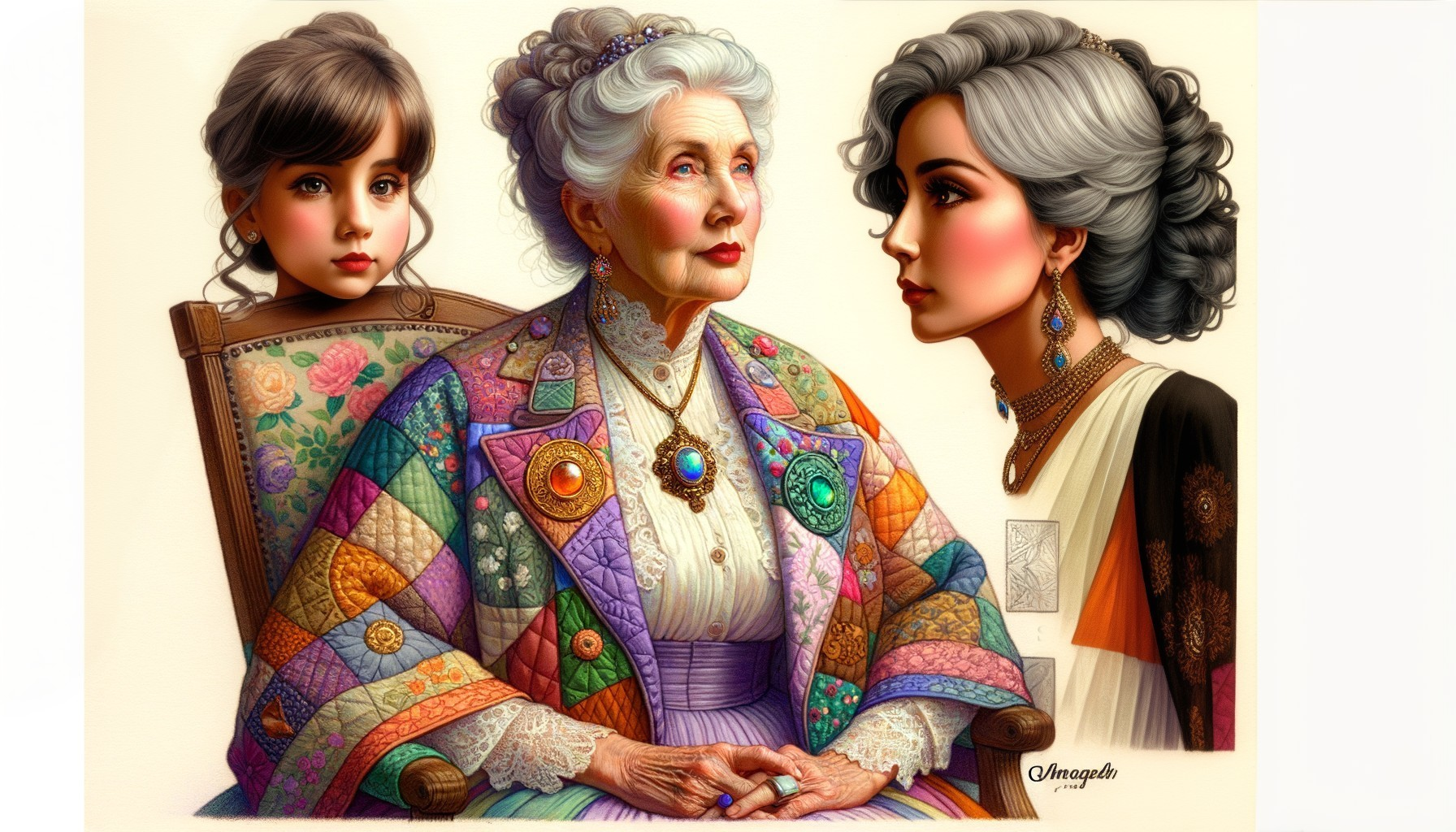 Prompt: "The portrait shows an elegant old lady wearing a coat of colorful patchwork, symbolizing the many stories and memories she has collected in her life. Her gaze is thoughtful and full of warmth, it shows pride in the achievements of children scattered in different parts of the world. She sits in her favorite chair, surrounded by photographs that capture the brightest moments of her life. Now her children are conquering new heights of the world and creating their own history. creating their own history. success mood art in the style of Franz Xavier Winterhalter"