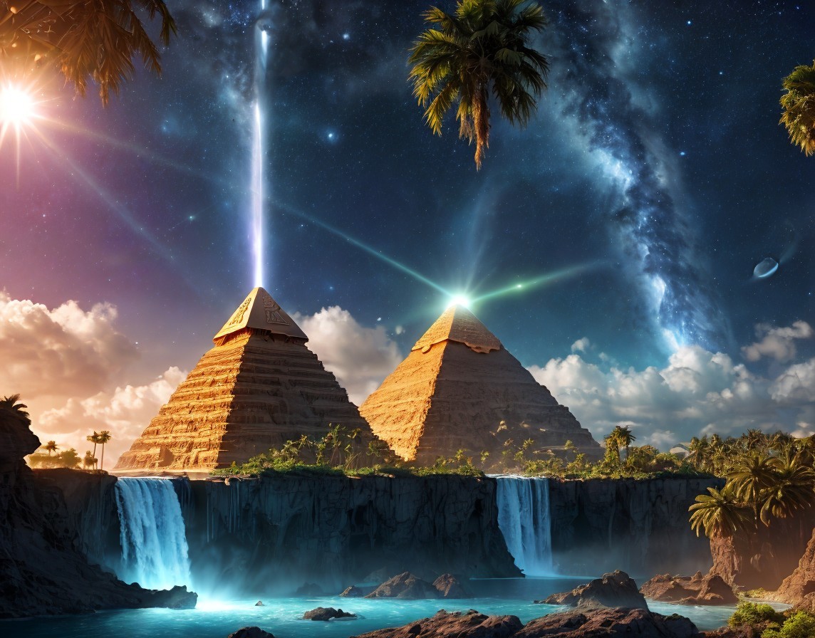 Prompt: Alien planet with palm trees and waterfalls flowing into an empty cosmic space with clouds of nebula, Cosmic Extraterrestrial pyramid menagerie intertwined with advanced alien technology. flying saucer, pyramid with the sun and moon, astral projection, UFO in front of 3D-rendered bioluminescent mushrooms and colossal crystals. Picture a time-traveling alchemist surrounded by symbols like sacred geometry, mystical occult imagery (hamsa, eye of providence), talismans, esoteric tarot cards, and the all-seeing eye. Realistic and natural elements, under a cosmic sky. alien plants, psychedelic elements like galactic DMT entities, hallucinogenic vibes, shamanic horror LSD art, and the ethereal DMT realm. In the style of Cameron Gray