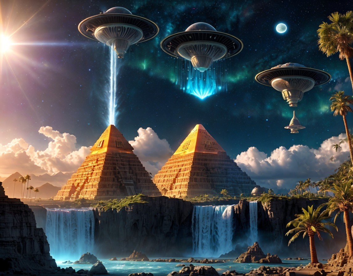 + Prompt:Alien planet with palm trees and waterfalls flowing into a cosmic abyss, Cosmic Extraterrestrial pyramid menagerie intertwined with advanced alien technology. flying saucer, pyramid with the sun and moon, astral projection, UFO in front of 3D-rendered bioluminescent mushrooms and colossal crystals. Picture a time-traveling alchemist surrounded by symbols like sacred geometry, mystical occult imagery (hamsa, eye of providence), talismans, esoteric tarot cards, and the all-seeing eye. Realistic and natural elements, under a cosmic sky. alien plants, psychedelic elements like galactic DMT entities, hallucinogenic vibes, shamanic horror LSD art, and the ethereal DMT realm. In the style of Cameron Gray