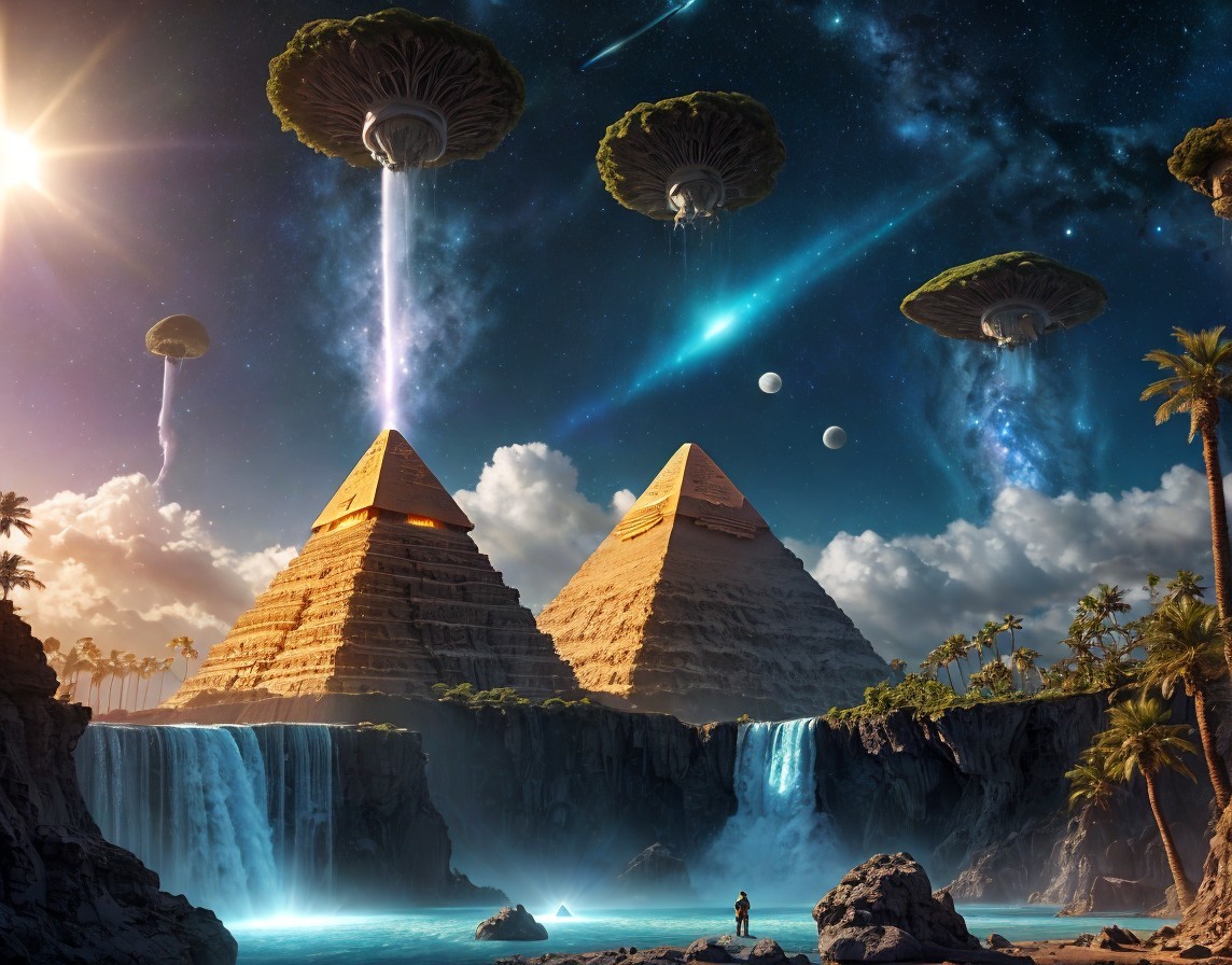 Alien planet with palm trees and waterfalls flowing into an empty cosmic space with clouds of nebula, Cosmic Extraterrestrial pyramid menagerie intertwined with advanced alien technology. flying saucer, pyramid with the sun and moon, astral projection, UFO in front of 3D-rendered bioluminescent mushrooms and colossal crystals. Picture a time-traveling alchemist surrounded by symbols like sacred geometry, mystical occult imagery (hamsa, eye of providence), talismans, esoteric tarot cards, and the all-seeing eye. Realistic and natural elements, under a cosmic sky. alien plants, psychedelic elements like galactic DMT entities, hallucinogenic vibes, shamanic horror LSD art, and the ethereal DMT realm. In the style of Cameron Gray