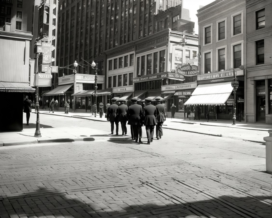 Black and White Photo of Vintage City Street Scene
