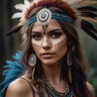 A young woman stands in a lush, green environment, adorned with a vibrant feather headdress and intricate jewelry. Her face features artistic markings, exuding a sense of cultural heritage and elegance.