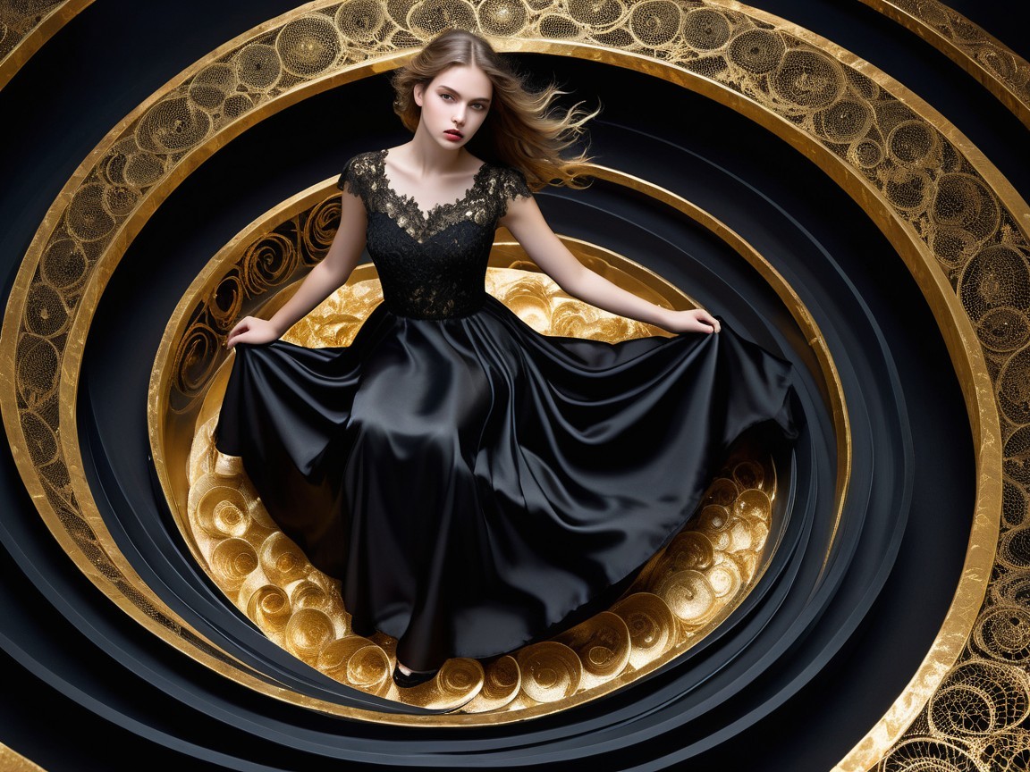 A woman in a flowing black gown sits gracefully on a circular gold-patterned surface. Her elegant dress and poised demeanor create a captivating and luxurious atmosphere.