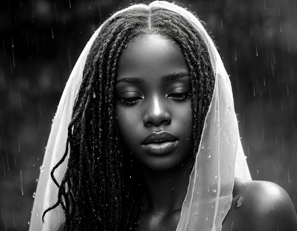 A monochrome portrait of a dark-skinned woman with wet hair, water droplets on her skin, and a translucent fabric draped over her head.