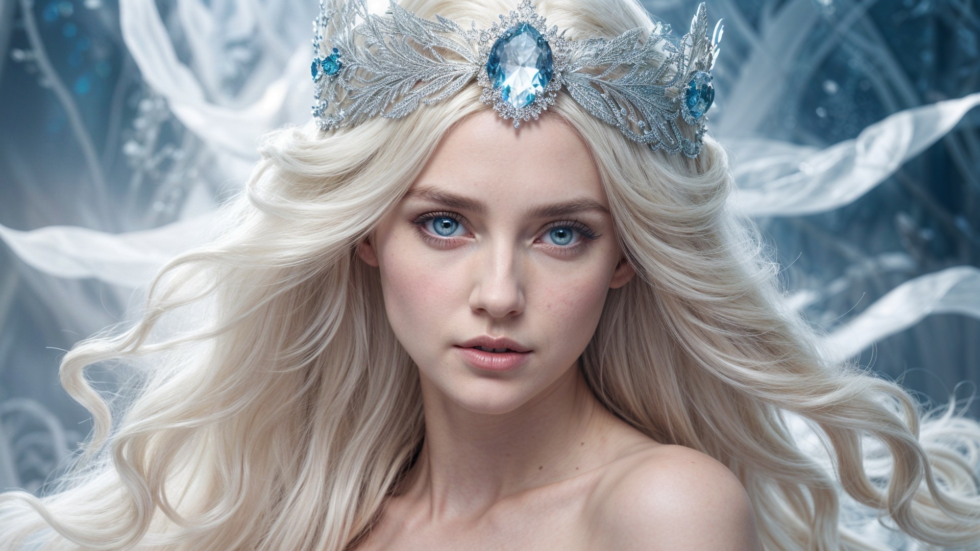 A stunning figure with long, flowing blonde hair adorned with an intricate silver crown featuring blue gems. She has captivating blue eyes and a serene expression, surrounded by a magical atmosphere.