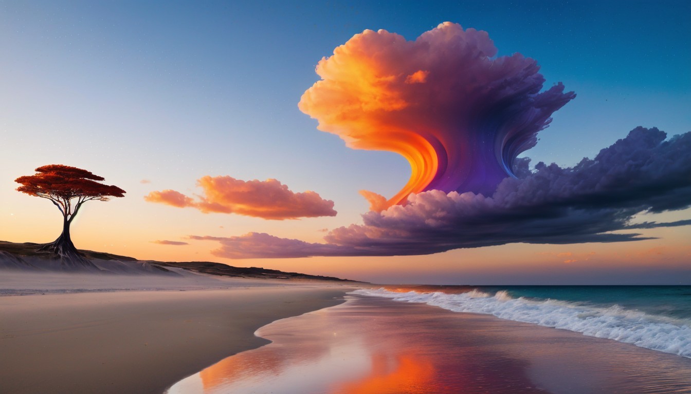 A vibrant tree with a fiery, cloud-like canopy stands on a serene beach, reflecting in the calm water. The scene combines intense colors against a clear blue sky, creating a dreamlike atmosphere.