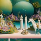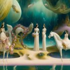 A surreal scene featuring elegant figures in flowing gowns alongside white horses. The background boasts vibrant, swirling colors and fantastical elements, creating a dreamlike atmosphere.