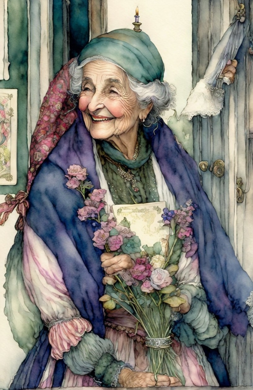 A wise, elderly woman with silver hair and a warm smile holds a candle. She wears an elegant blue robe and jewelry, surrounded by candles and vintage books in a cozy, softly lit setting.