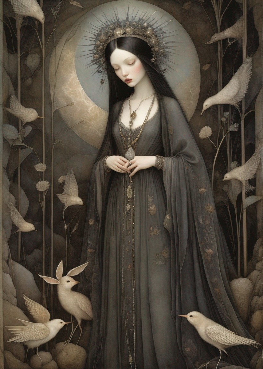 Ethereal woman in medieval-style gown with halo, surrounded by birds and dandelions