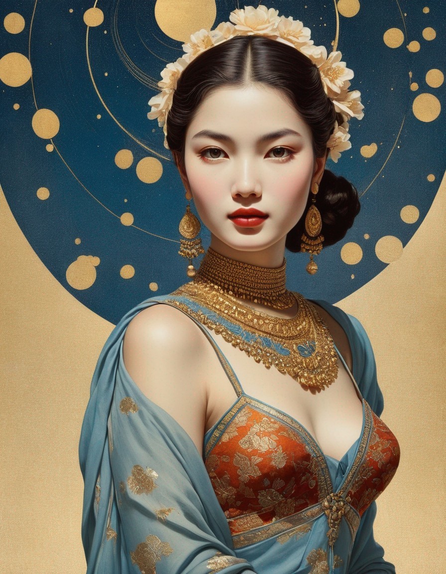 fashionable young woman - Tonkin Delta | l'indochine | Vintage Poster | French . dark sky-blue and dark gold, energy-filled illustrations, delicate pointillism, bold stencil, celestial, screen printing, organic (Padmanabha