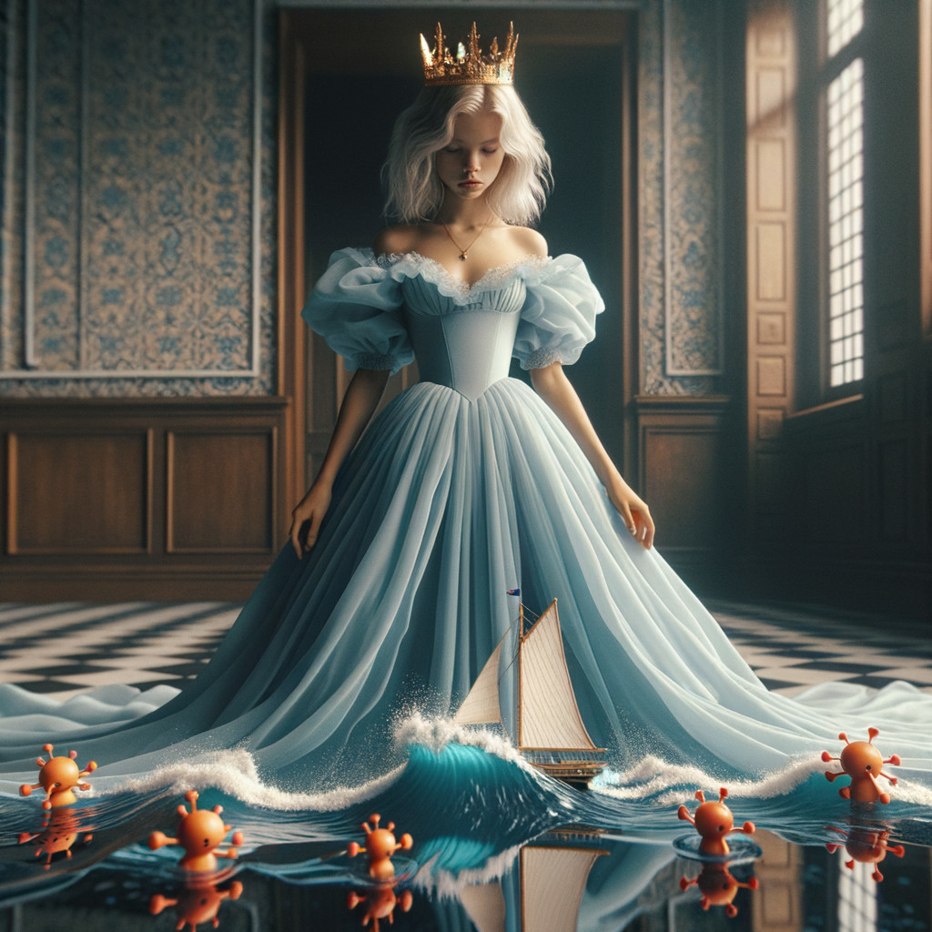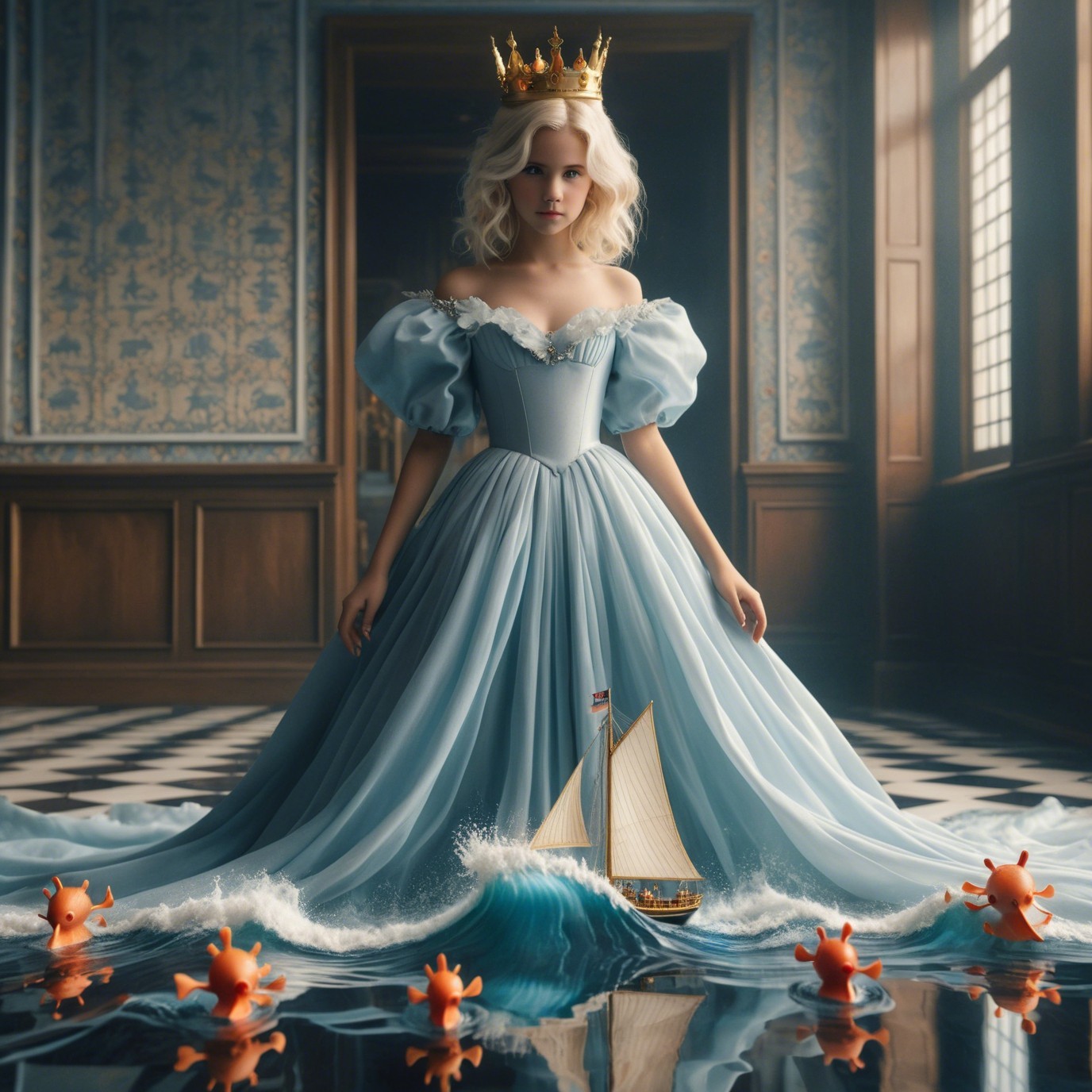 A young woman in a flowing blue gown stands in a grand room, surrounded by goldfish swimming in a reflective floor. A small sailboat navigates the waves at her feet, enhancing the fairy-tale atmosphere.