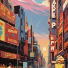 A vibrant cityscape at dusk features neon signs and colorful clouds. A sleek pink car sits in the foreground, surrounded by towering buildings illuminated by glowing advertisements.