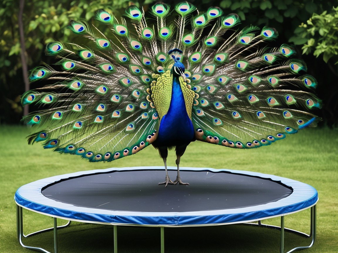 A vibrant blue and green peacock with its tail feathers fanned out, standing on a circular trampoline outdoors. The peacock's iridescent blue body and bright green upper back are visible, with numerous eye-spotted feathers creating a large, majestic display behind it. The trampoline has a black jumping mat and