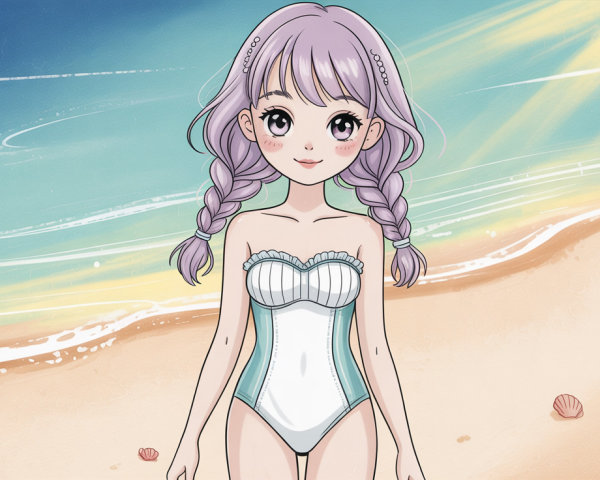 A charming character in a cute clover-patterned strapless swimsuit, radiating joy and playfulness. Her vibrant design and cheerful demeanor capture the essence of summer fun and youthful spirit.