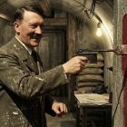 The image depicts a smiling man in a military uniform joyfully painting a heart on a wall in a dimly lit underground space, creating a contrast between the cheerful act and the setting.