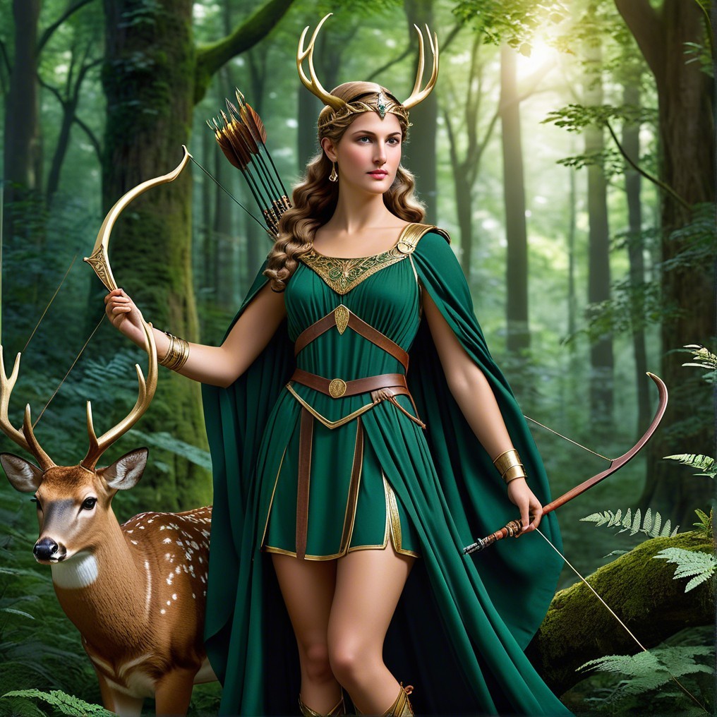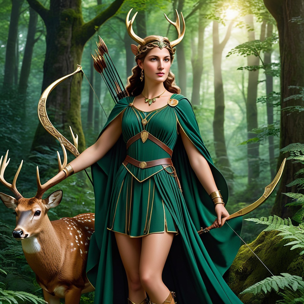 The goddess Diana stands in an enchanted forest beside a deer, poised and regal.