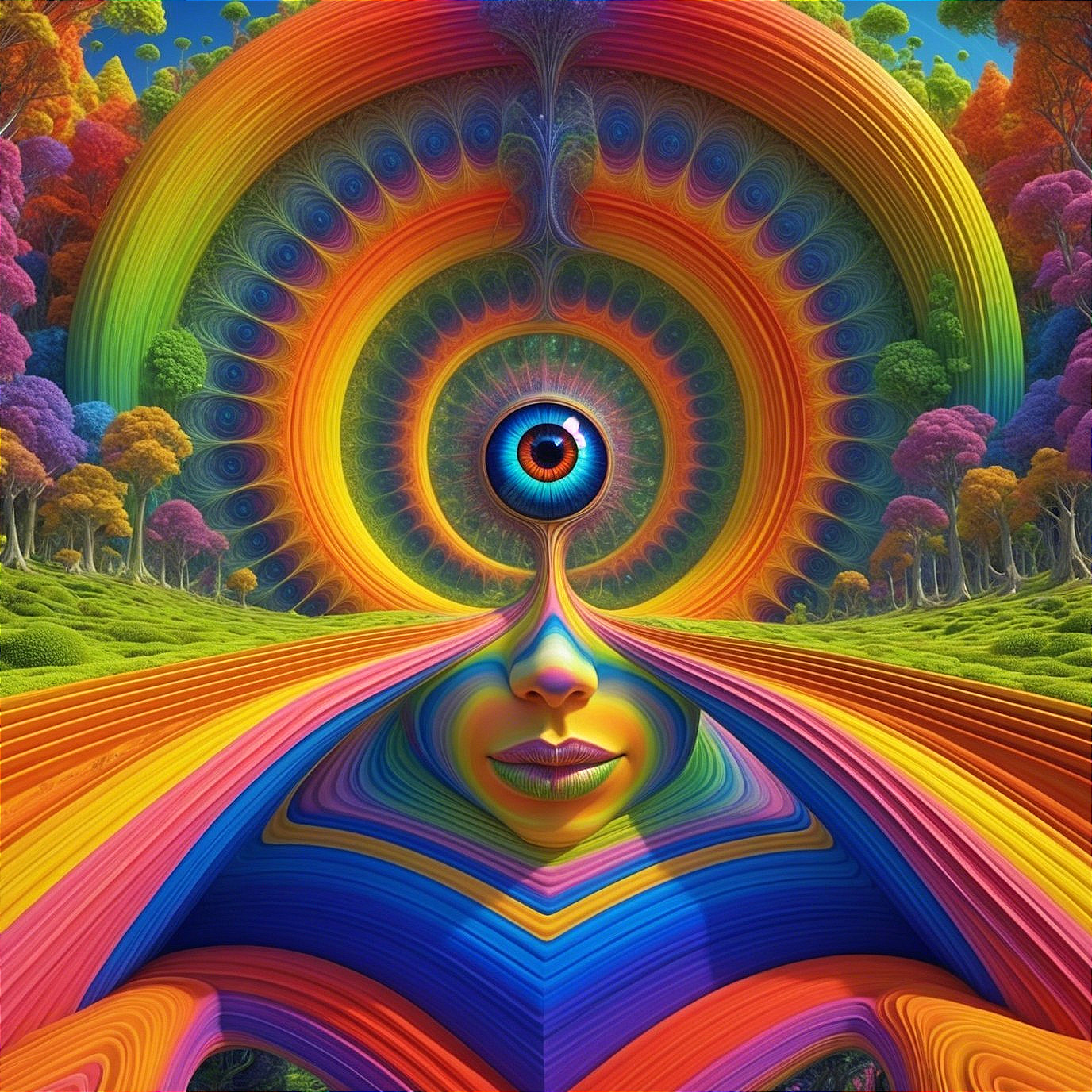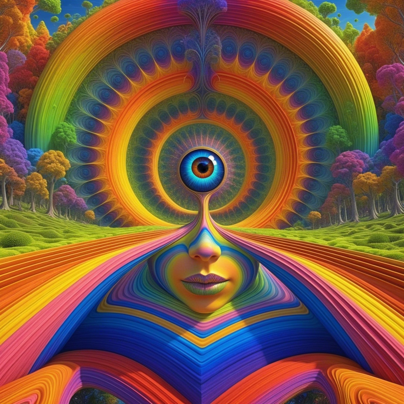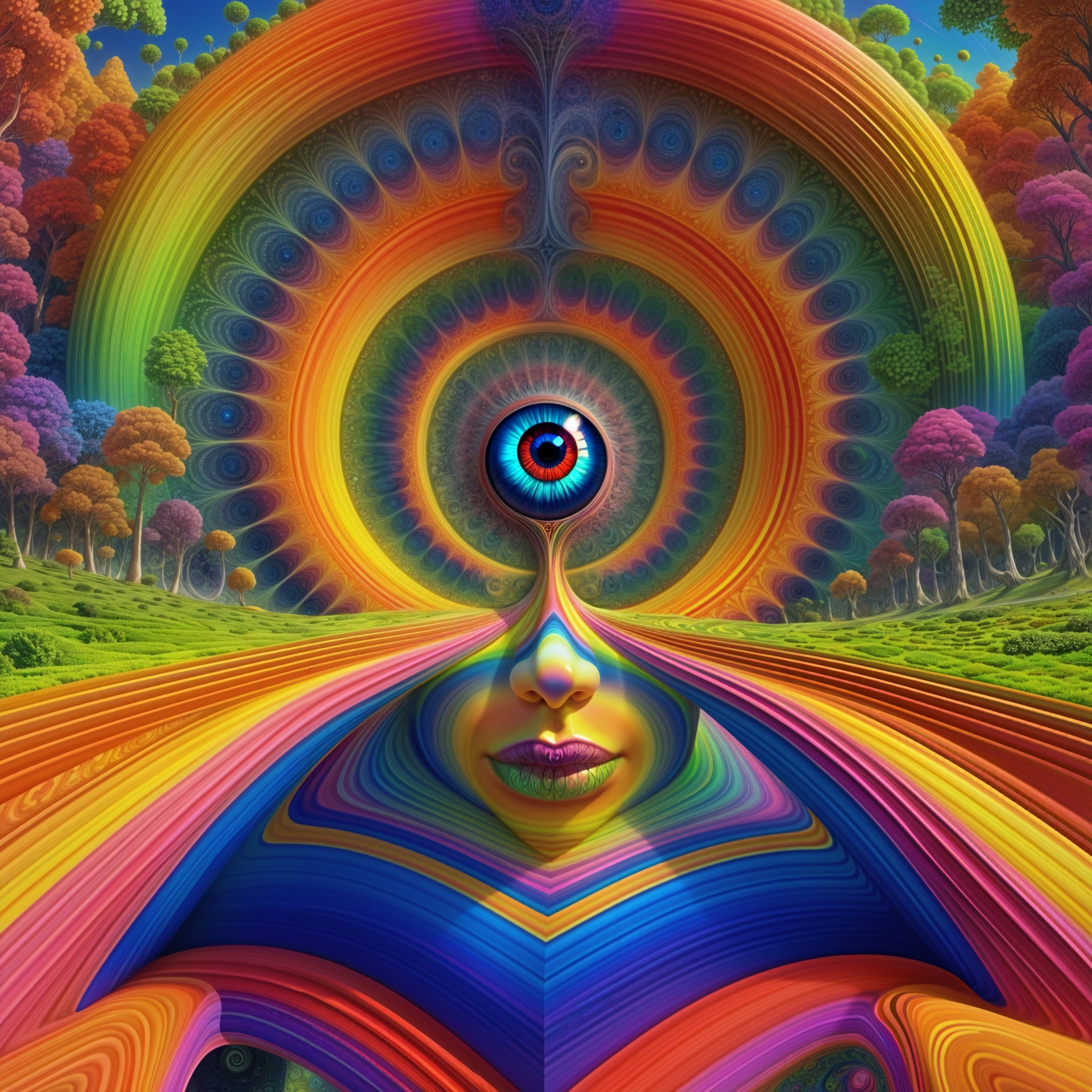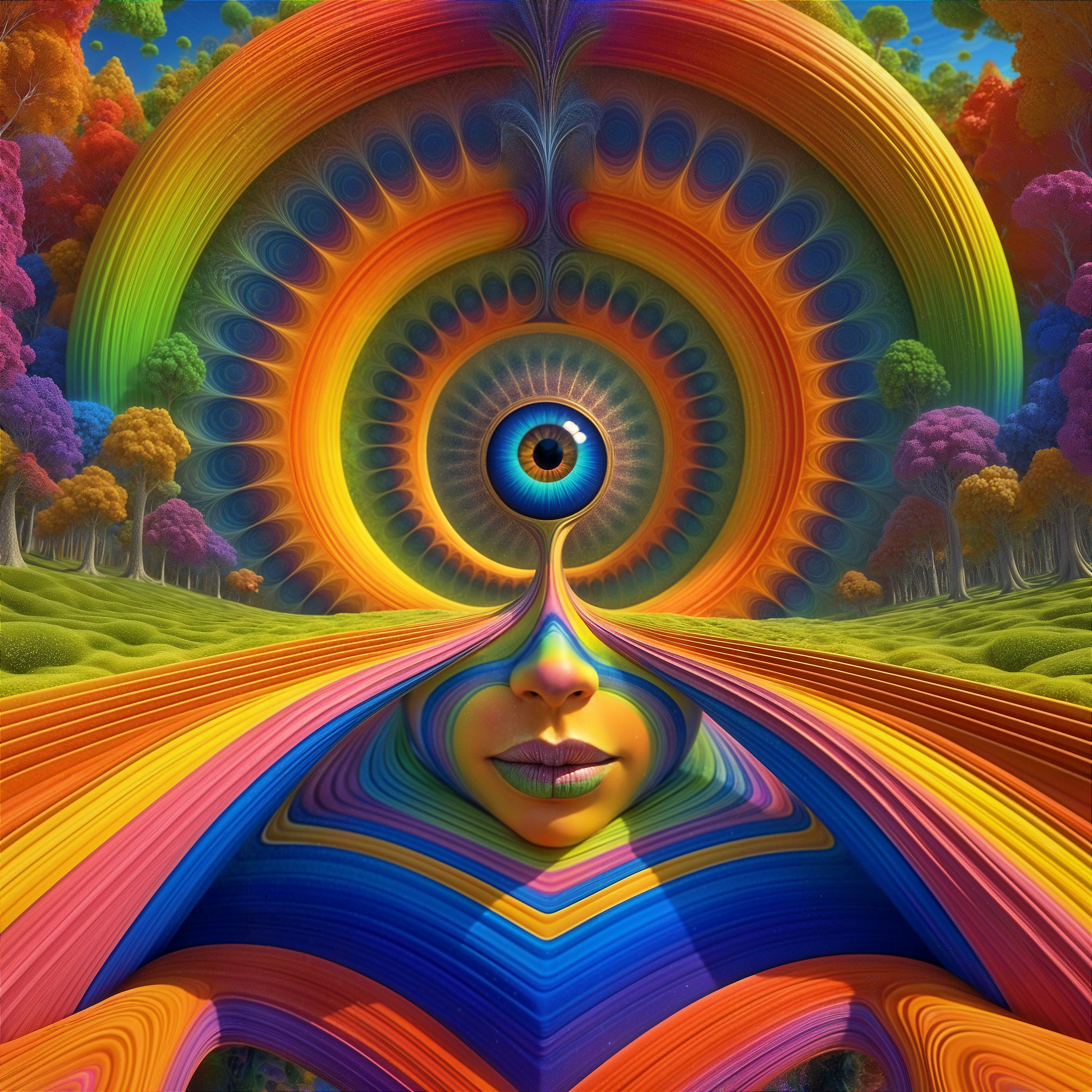 Prompt: I highly dimensional representation about the creation via the hyperbolic quantum instantiation of a human thought. odd, yet strangely beautiful, but conveys a sense of peaceful wildness as it stands looking about its domain... Fractal patterns incorporated into glass-smooth polished surfaces