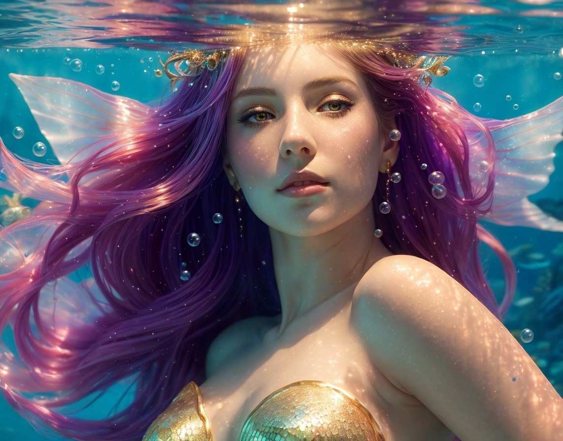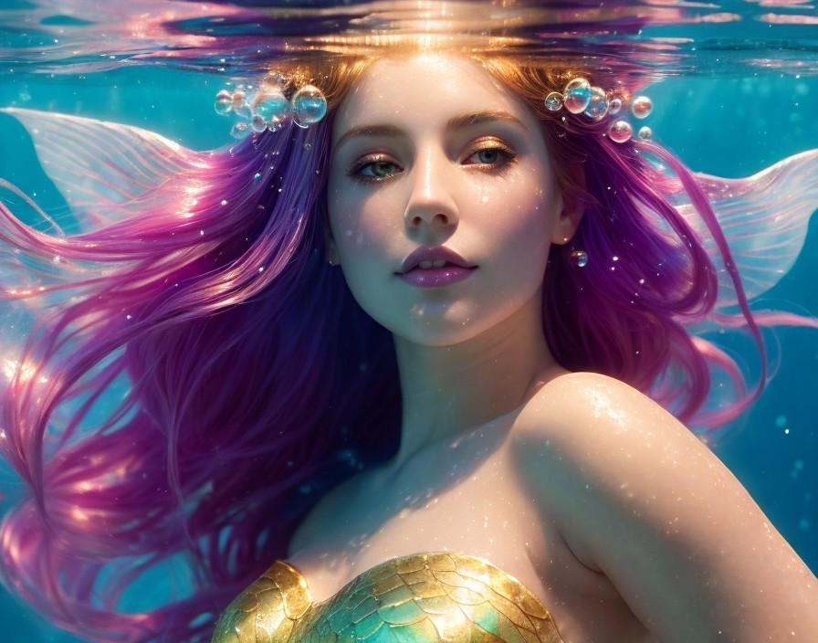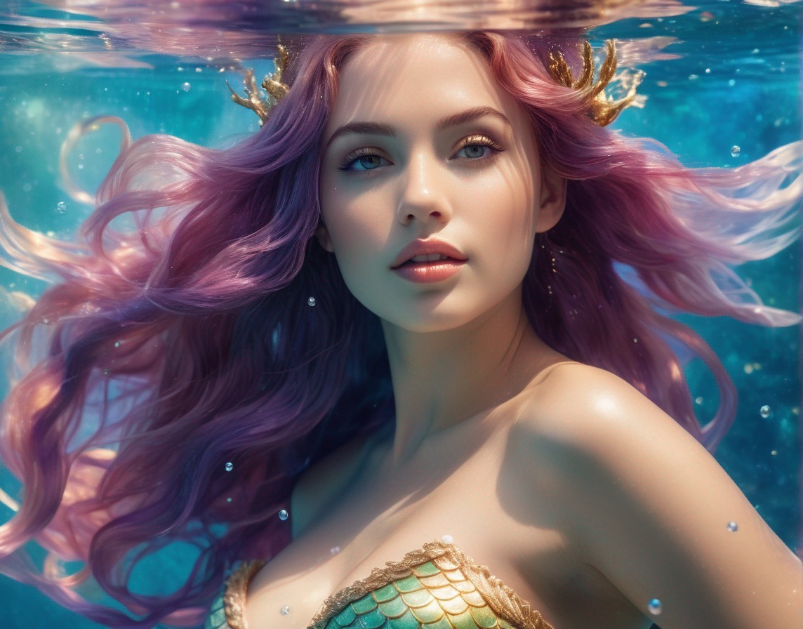 Mermaid with Pink Hair, Emerald Eyes, and Shimmering Scales in Water