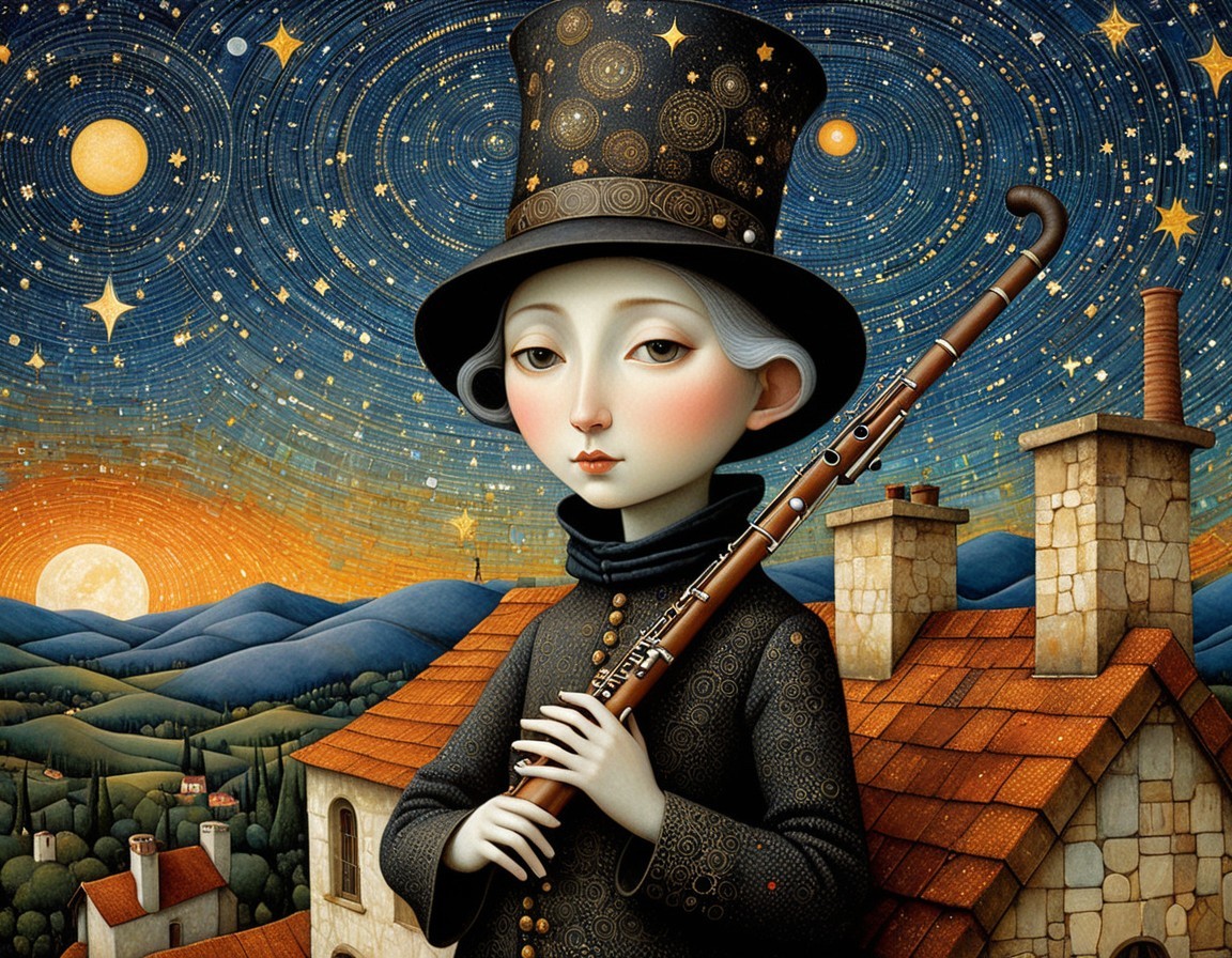 An illustrated character with a top hat and holding a flute, set against a whimsical night sky and rolling green hills.