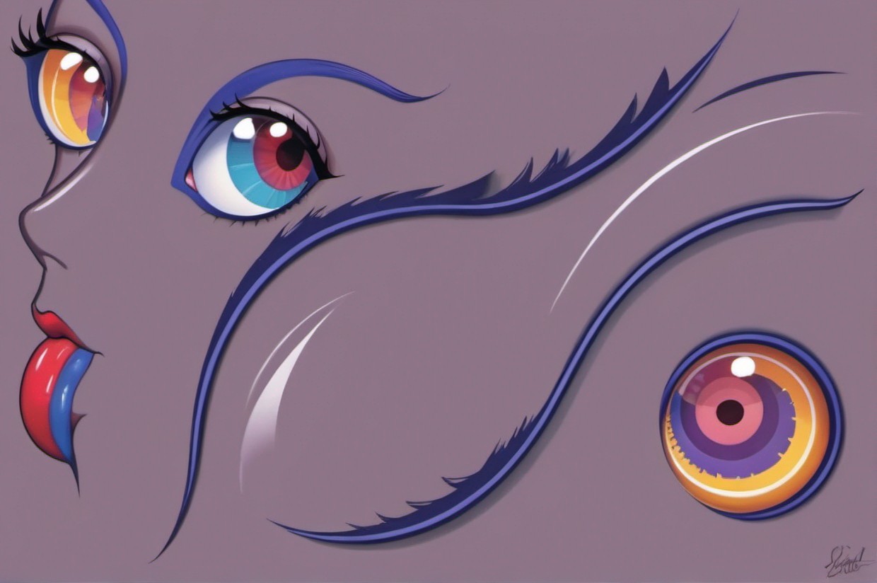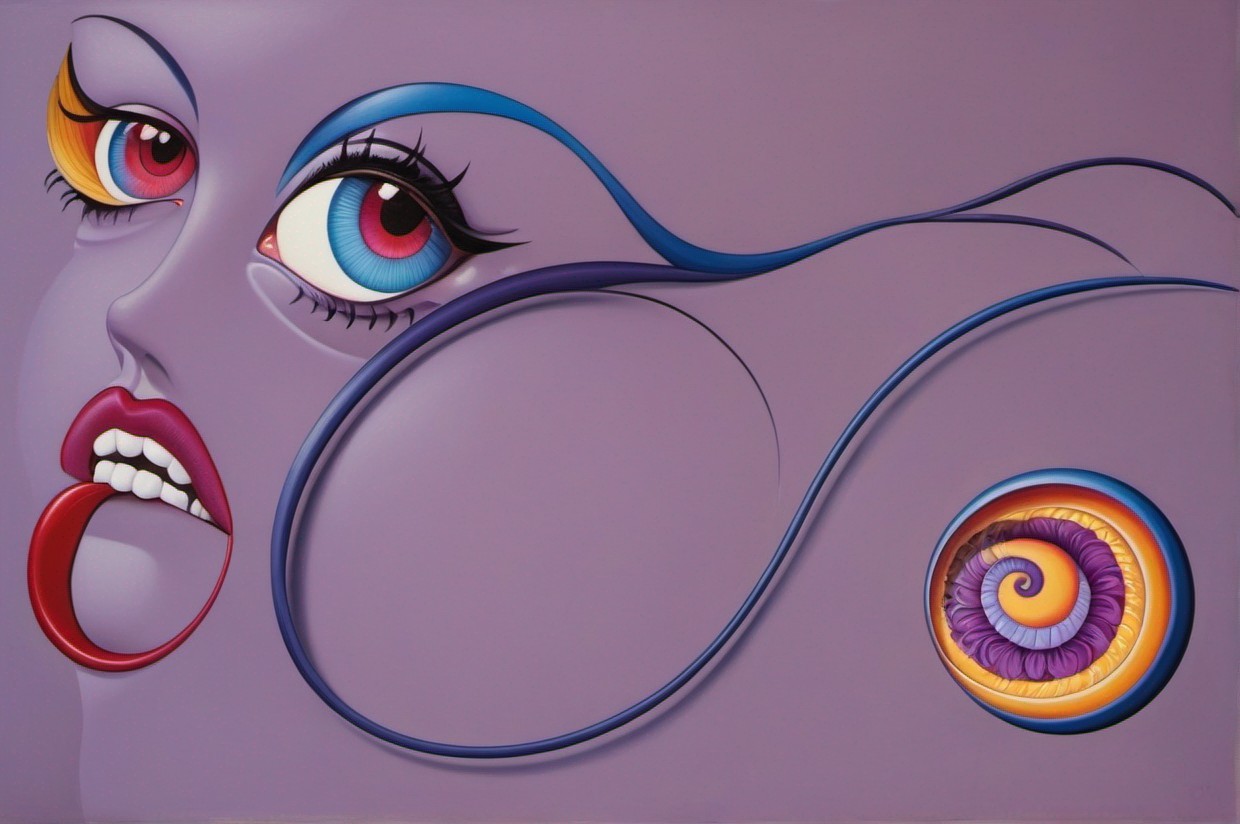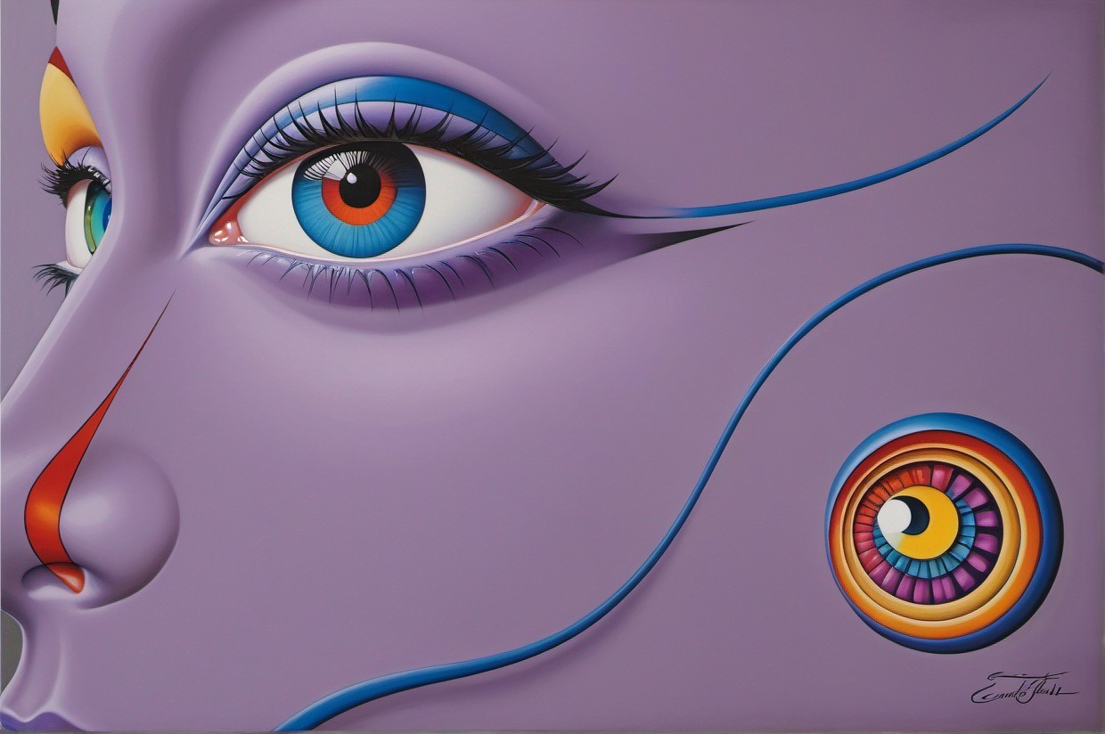 Surreal painting: female face with vivid eyes & nautilus shell pattern