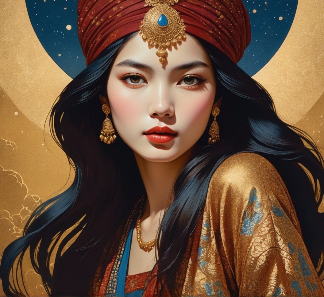 Prompt: fashionable young woman - Tonkin Delta | l'indochine | Vintage Poster | French-portrait. She had been born with a face that would let her get her way Big" dark sky-blue and dark gold, energy-filled illustrations, delicate pointillism, bold stencil, celestial, screen printing, organic (Padmanabha