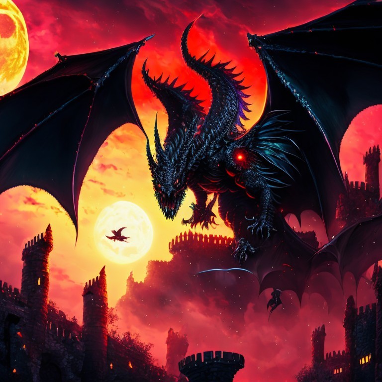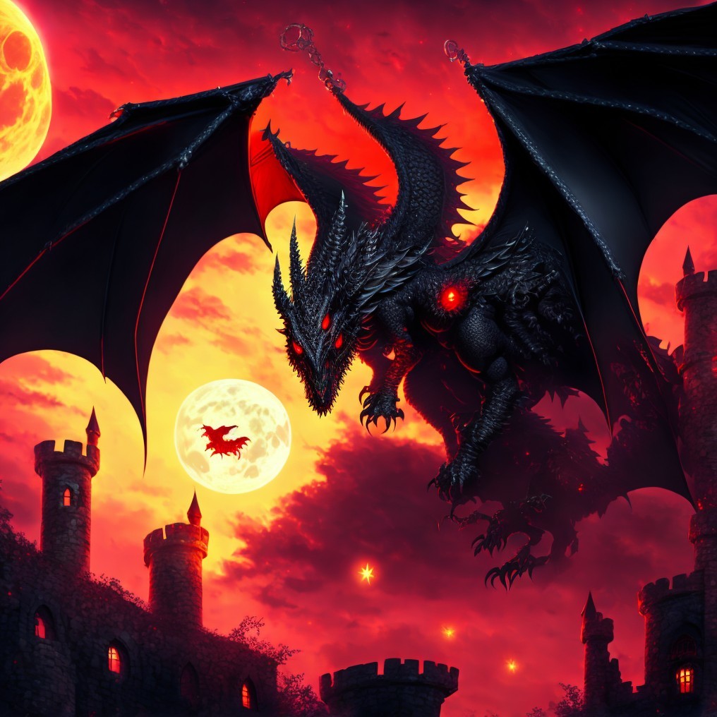 A fierce black dragon with red eyes perches atop a castle under a blood-red sky with dual moons and another dragon flying in the distance.