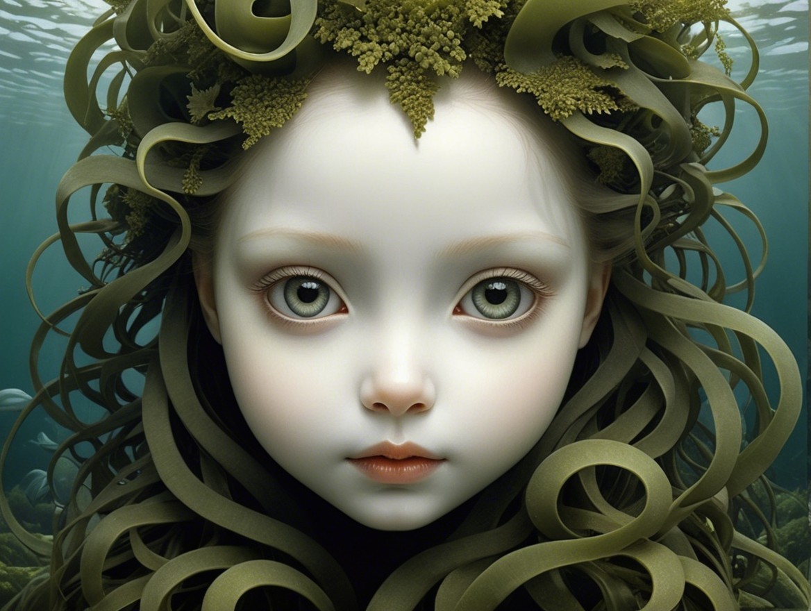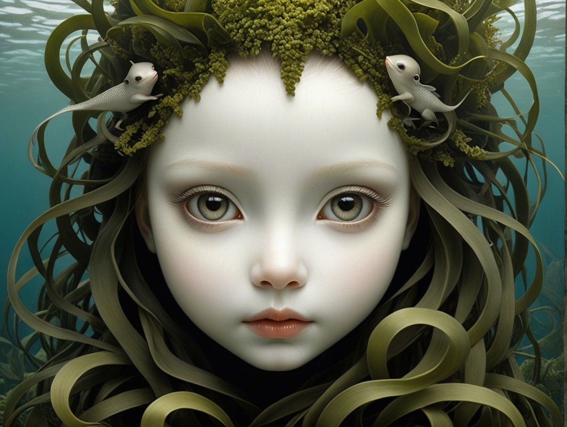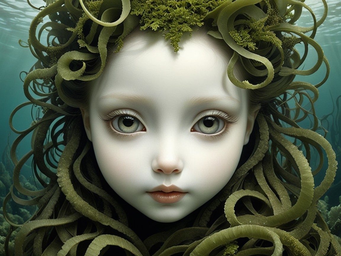 A serene underwater portrait of a girl with long, flowing seaweed-like hair, featuring striking green eyes and pale skin, surrounded by a mystical aquatic environment.