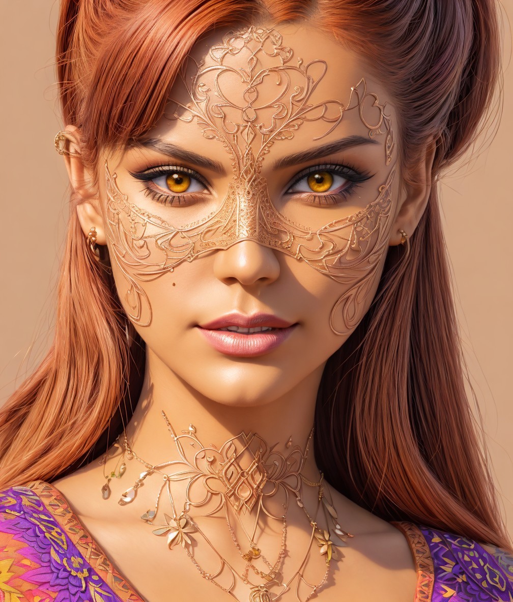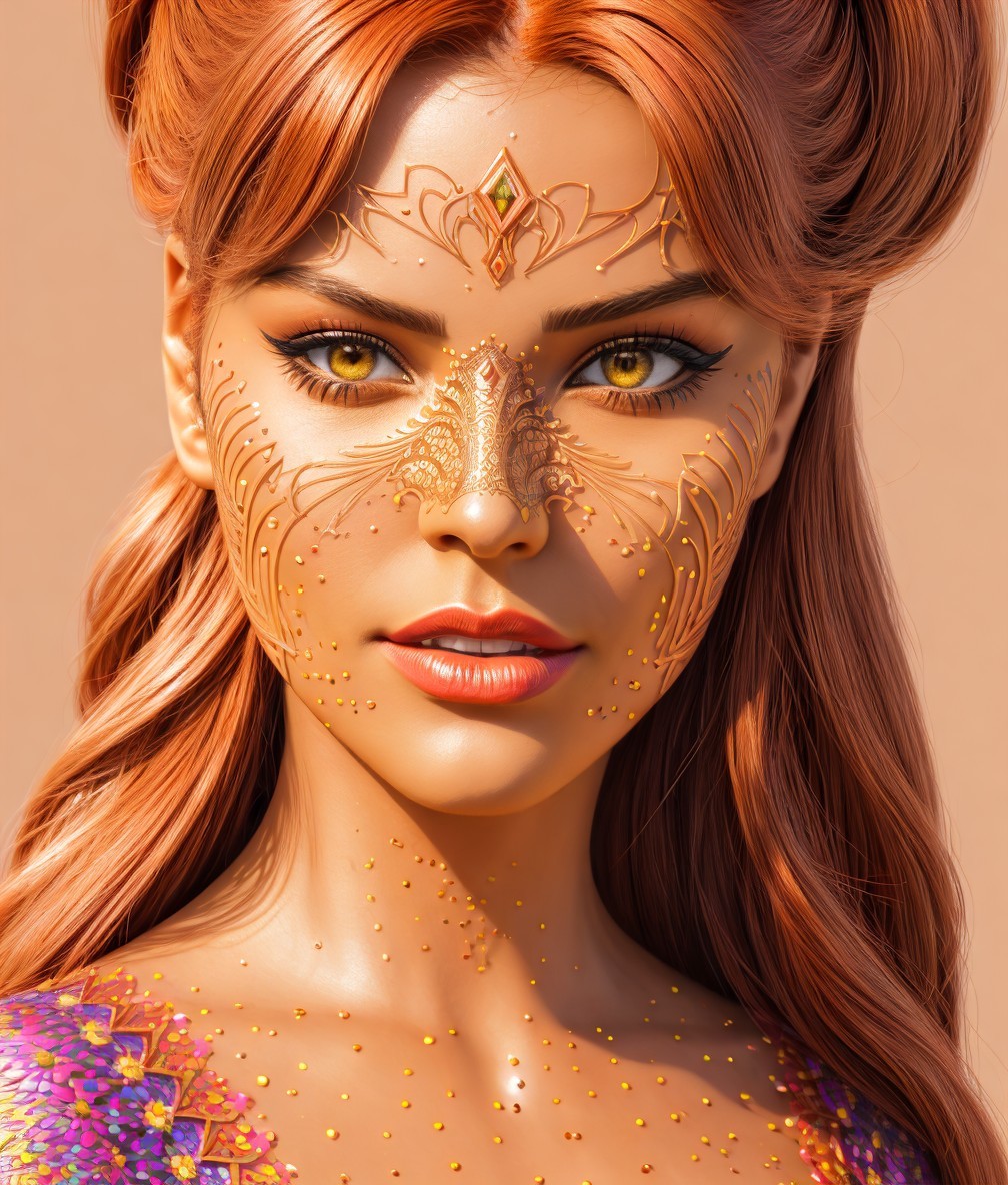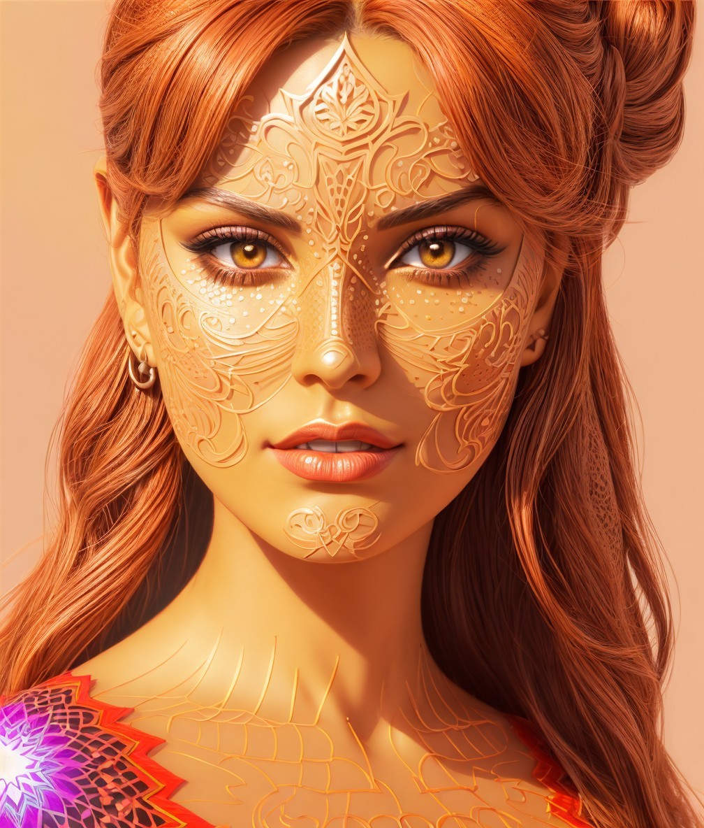 Detailed Pointillism portrait of female devilish superheroine, wartecolor and ink, 3d effects 1.8, high coloring, dine face tattoos, Stylized illustration, intricate details of lineage, triadic color scheme brown beige yellow, hues, grain, auburn rim lighting, ornamental strokes, fine lines 1.7, hues, anisotropic filtering 1.7, shadow mapping 1.3, raytraced shadows 1.8, calm synthetic, spiritual essence, encaustic strokes, shiny, fiery, dethereal, coffinwood 1.9, cottagegore 1.9, atompunk 1.7, American gothic 1.7, tints of 1970s advertising art, varnished, complexion 1.4, brightness 1.9, vector 9:5, octane render illustration of female face, auracore 1.7, tints of linocut, style of Geof Darrow and Steve Hanks, encaustic strokes, stylized lineage illustration,  american gothic 1.7, brushed textures in gouache, impasto, mezzotinto, thick pasture, stacked up perspective 1.7, ambient occlusion 1.9, grain, Schreger lines 1.7, colorful reflections, skin textures,  complexion 1.4,