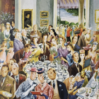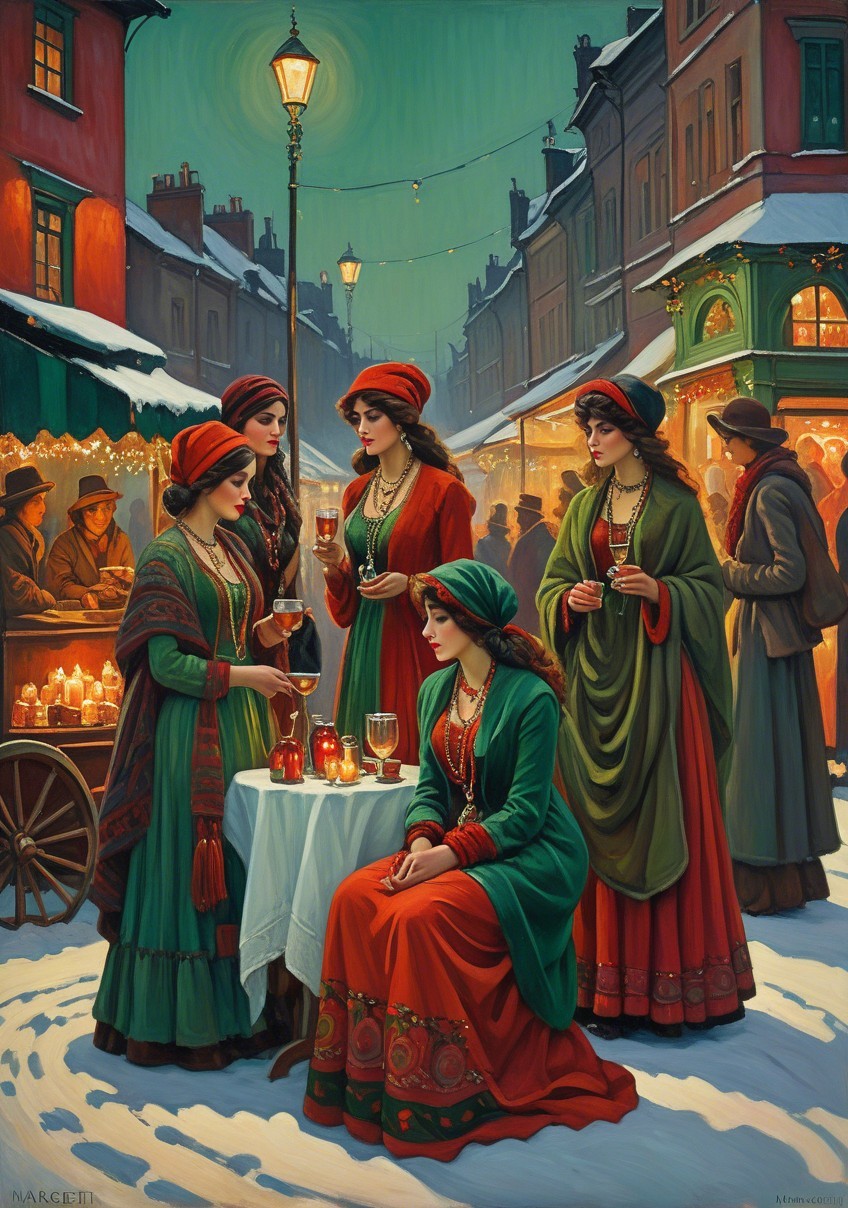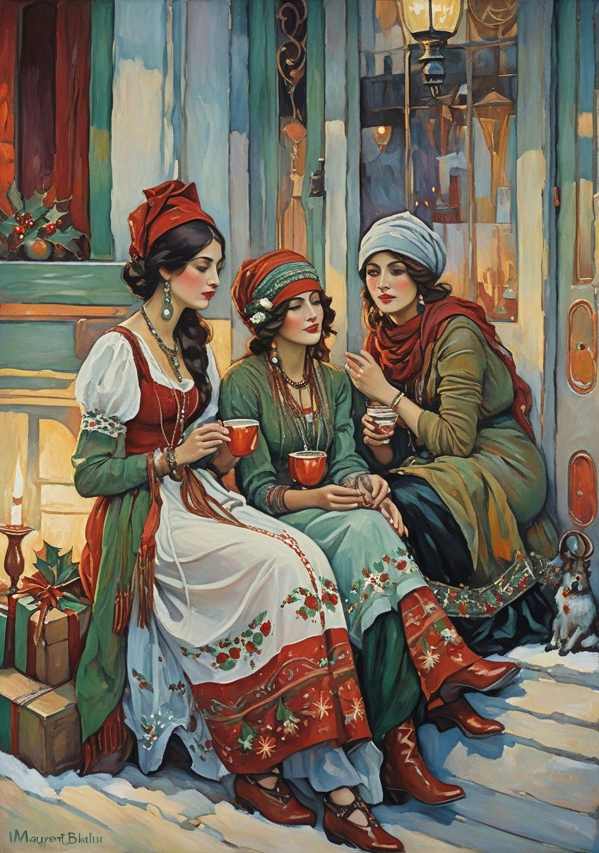 An oil painting features a group of four women gathered around a small table, with an additional woman seated at the table, all dressed in long, flowing garments with vibrant green, red, and gold accents. The woman seated to the right is dressed in a dark green overgarment and a long reddish