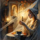 A serene woman in a soft gown sits by a window adorned with autumn leaves. She gently holds small pumpkins, surrounded by a warm glow from a candle, evoking a cozy, harvest vibe.