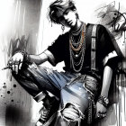 A stylish young person poses in front of a colorful graffiti backdrop. They're wearing a black denim jacket, graphic tee, and distressed jeans, adorned with multiple chains and accessories.