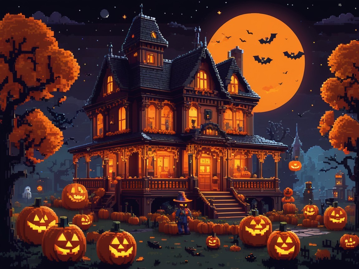 A spooky pixel art scene featuring a haunted house with glowing windows, surrounded by carved pumpkins and playful ghosts. A bright orange moon and bats complete the Halloween atmosphere.