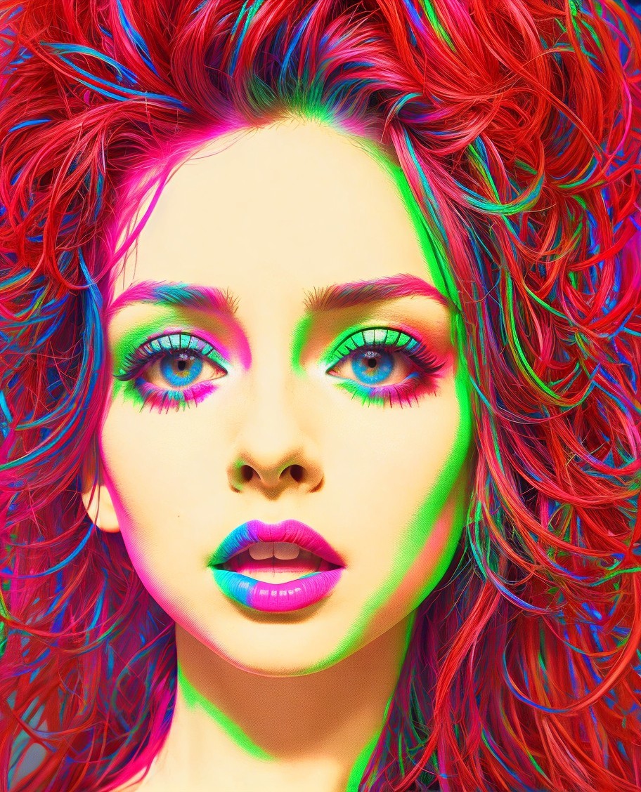 Prompt: Neon art, high coloring 1.9, fluorescent colors in red, blue, green, beige, producing a psychedelic strobe effect, (triadic color scheme green red blue, chromatic aberration), contrast colors, high coloring, detailed close-up portrait of female in pop art style 0.7, 3d effects 1.8, ambient occlusion 1.5, anisotropic filtering 1.7, shadow mapping, raytraced shadows 1.8, dynamic lighting 1.7, 3d artwork, hues, fractals in background, contrast colors, golden ratio, synthetic, symmetric, brightness 1.9,