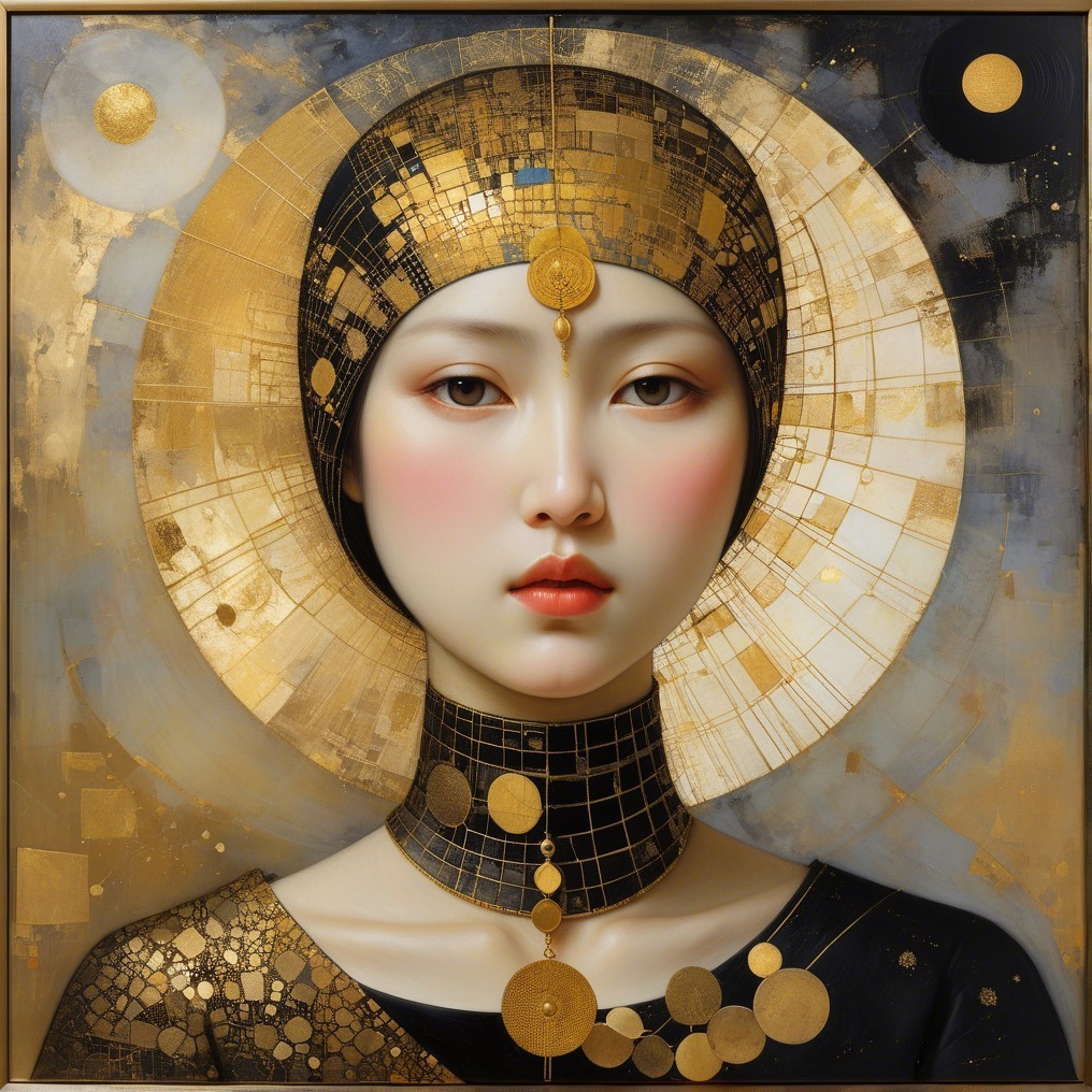 The artwork features a serene woman with a striking blue mask and ornate gold accents. Abstract shapes and vibrant colors create a harmonious blend of modern and traditional elements.