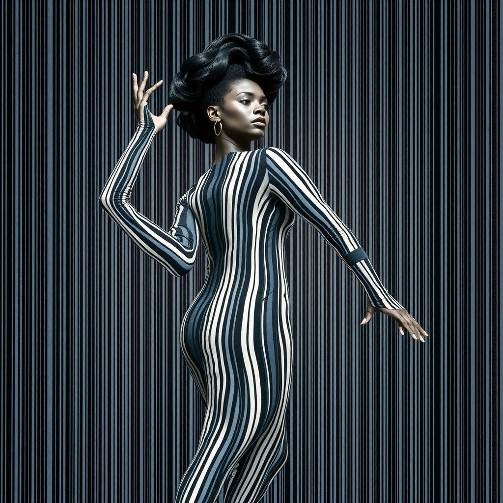 A stylish model poses confidently in a sleek, striped bodysuit, showcasing her vibrant afro against a backdrop of vertical lines. The image epitomizes bold fashion and dynamic movement.