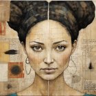 A portrait of a young woman with striking blue eyes and intricate hairstyles, set against a dreamy backdrop of whimsical castles and soft, muted colors. A blend of fantasy and realism.