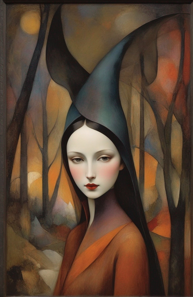 Beautiful dark witch. The veil between reality and fantasy is but a whisper, a mystical avatar of the air danced with grace and elegance. Its movements fluid and mesmerizing, painted the sky with vibrant hues, captivating all who behold its otherworldly performance, by Marie Laurencin, by Niccolai Abraham Abildgaard, detailed face features, sharp eyes, soft skin, harmonious, expressive, cinematic, photorealistic, evocative, gorgeous, lovely, heavenly, award winning.