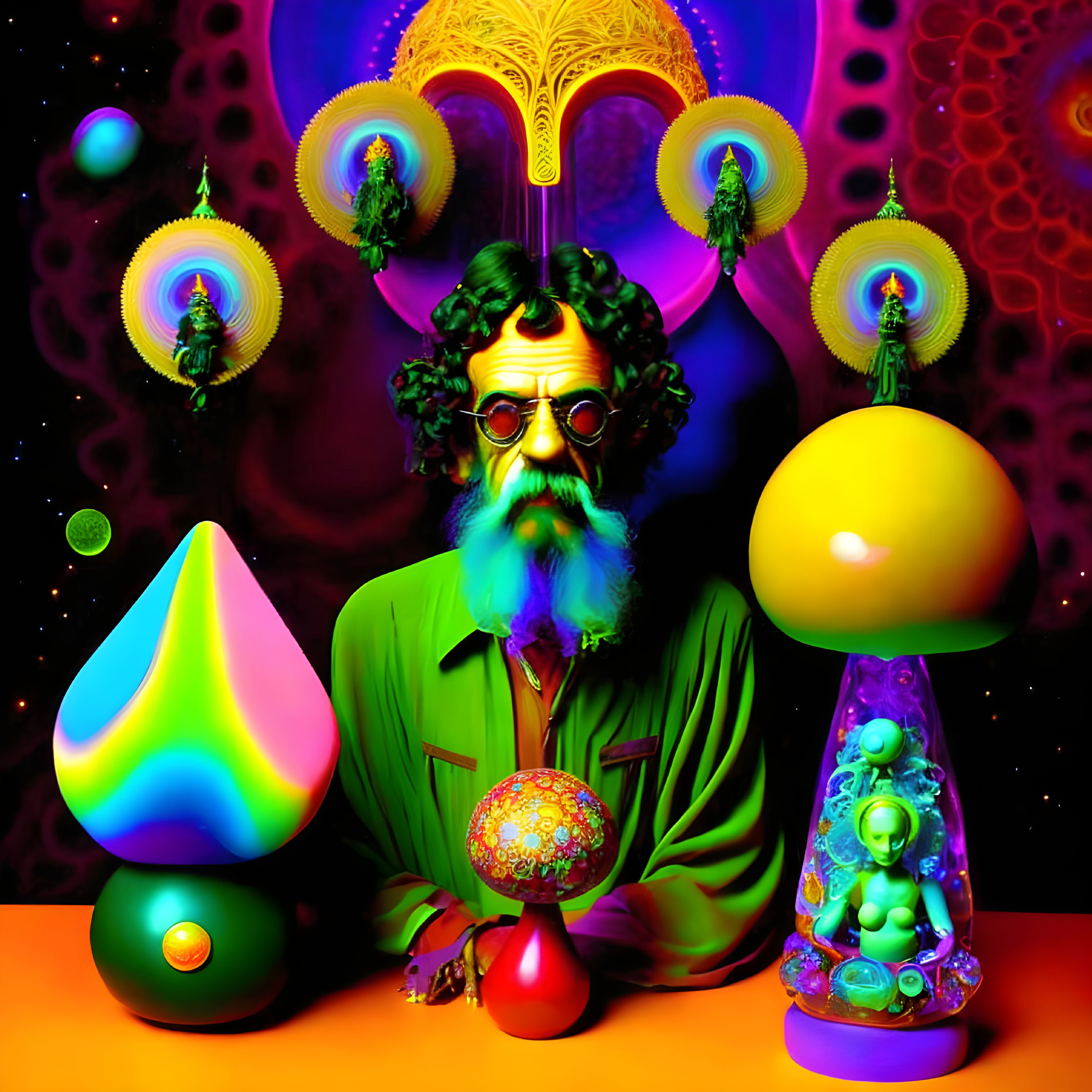 Prompt: "Terence McKenna in the realm of magic mushrooms with entities that look like plastics in the colors of plants and stones and very old 3D-wallpapers."