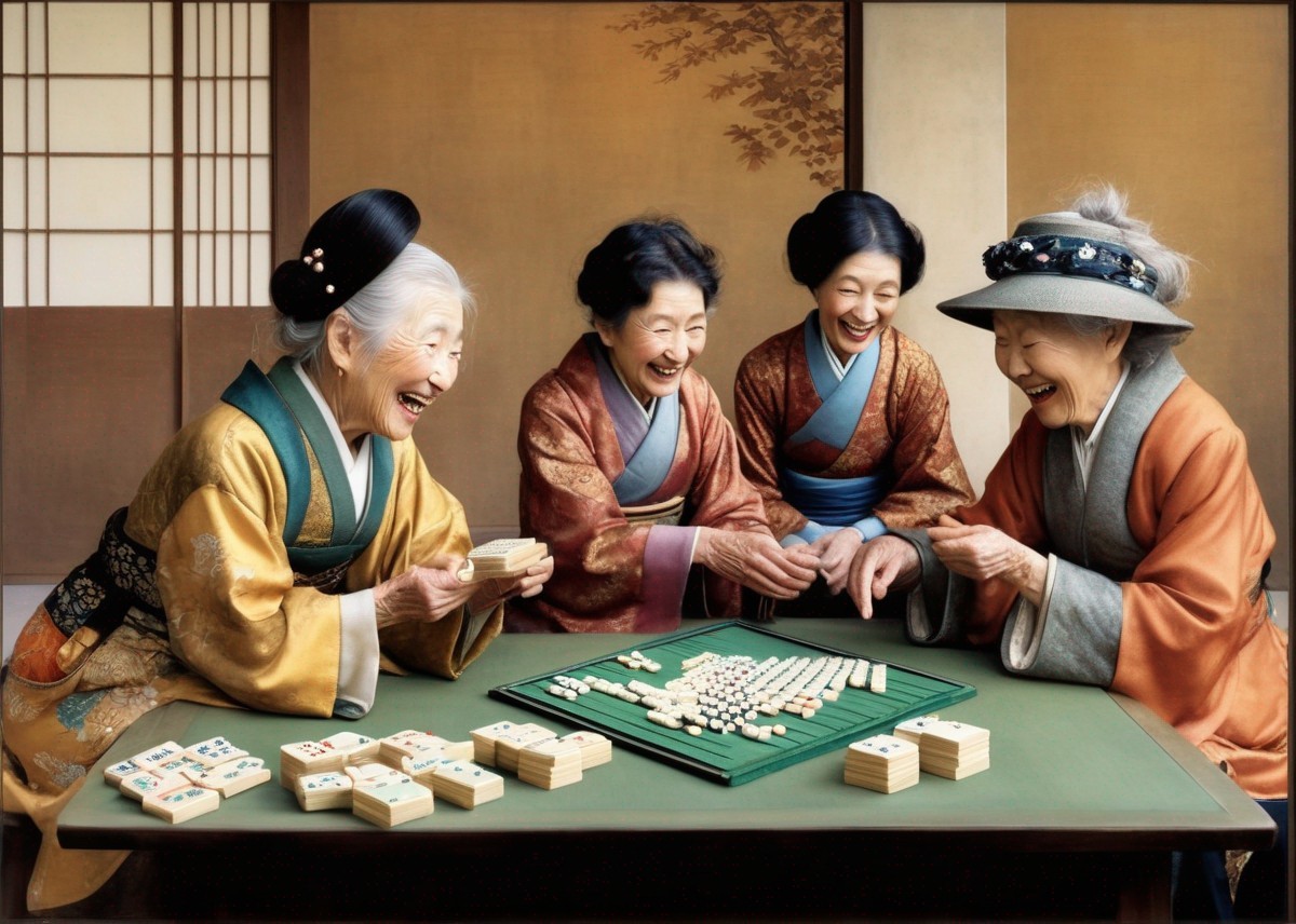 Three elderly ladies laugh joyfully while playing mahjong indoors, wearing traditional attire and hats.