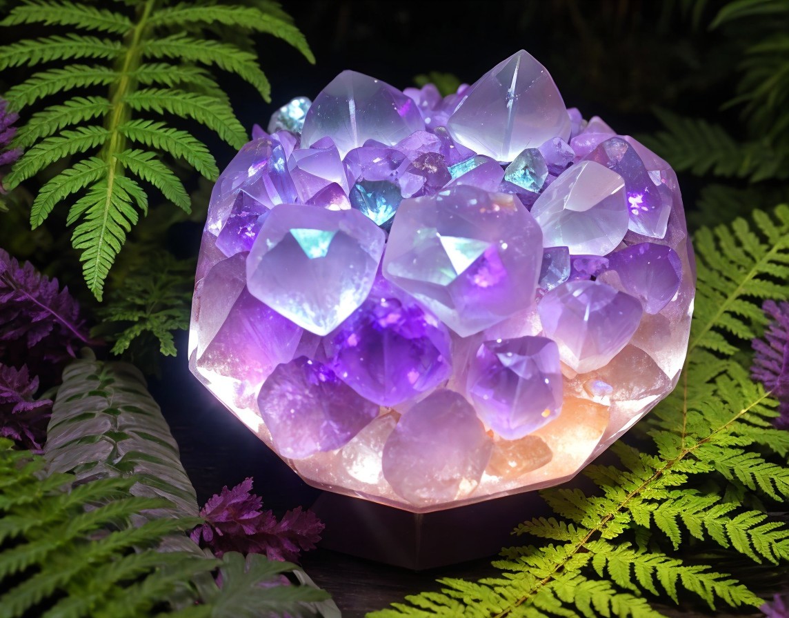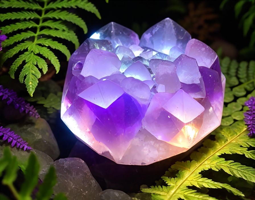 Illuminated amethyst crystal cluster with fern leaves on black background