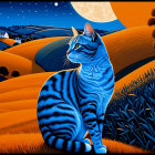 A vibrant, stylized landscape features a striped cat sitting in a field of flowers under a moonlit sky, with rolling hills and a cozy house in the background, creating a serene evening scene.