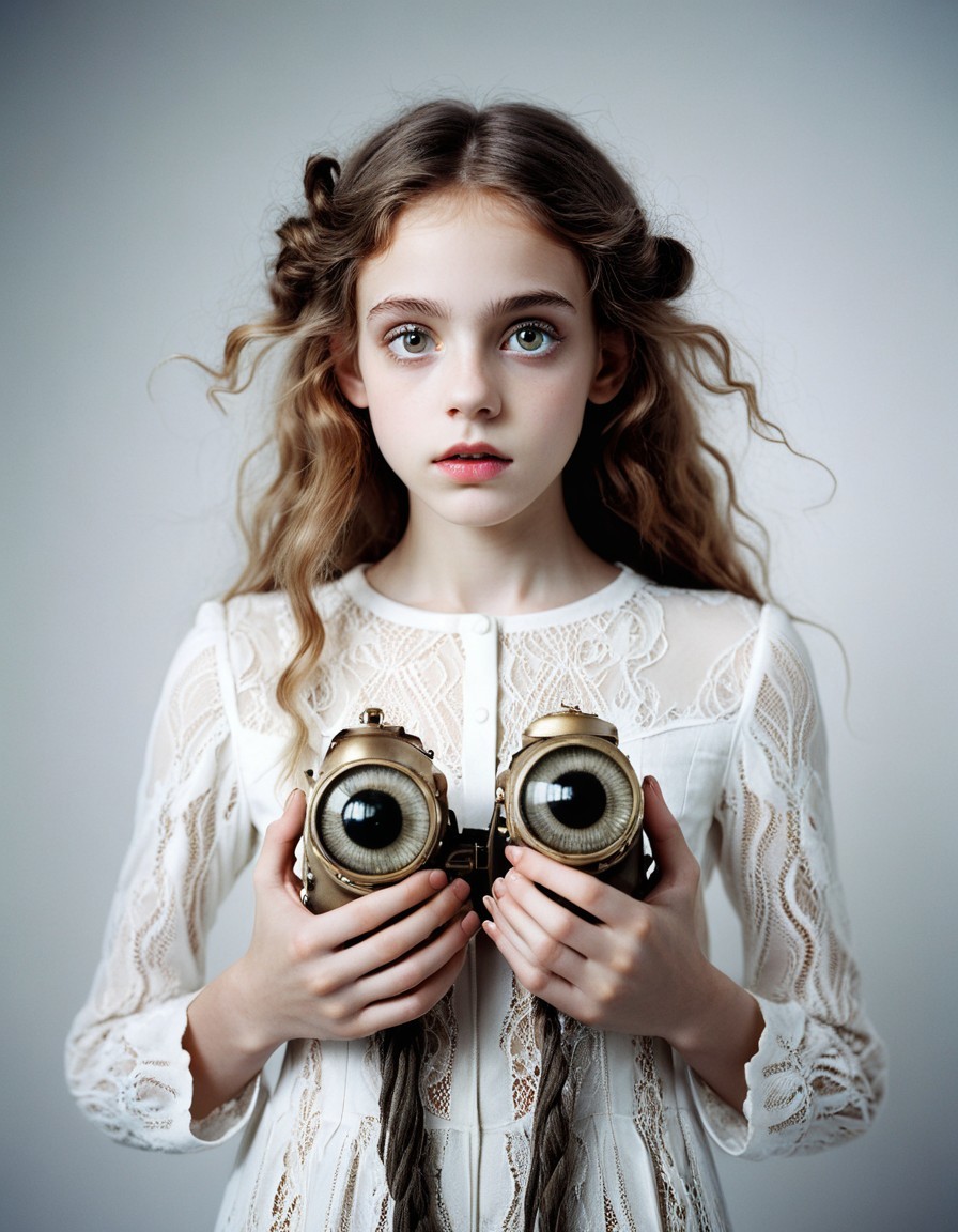 A young girl with wavy hair stands holding a pair of large, vintage-looking binoculars. She wears a delicate lace dress and gazes thoughtfully, evoking a sense of curiosity and wonder. The true horror of an AI never shows itself as such.