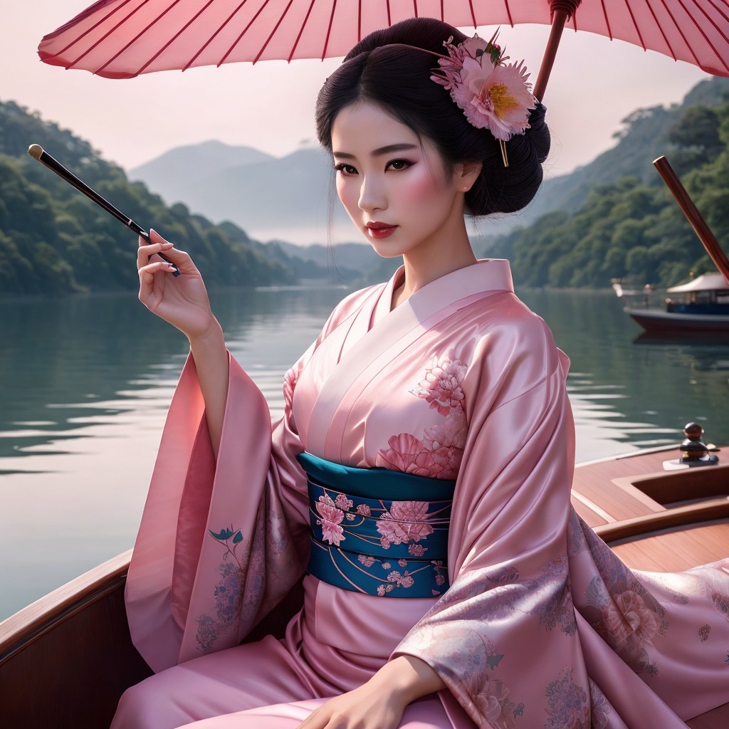 Geisha, Beautiful young woman, wearing a silk pink kimono, perfect face and body, sails on a boat on the lake, neo-surrealism. Dadaist setting in the style of Marco Mazzoni, Karol Bak, Luis Rory and Tom Bagshaw in asynchronous, delicate colors, anatomically correct, very attractive, Perfect face, body,