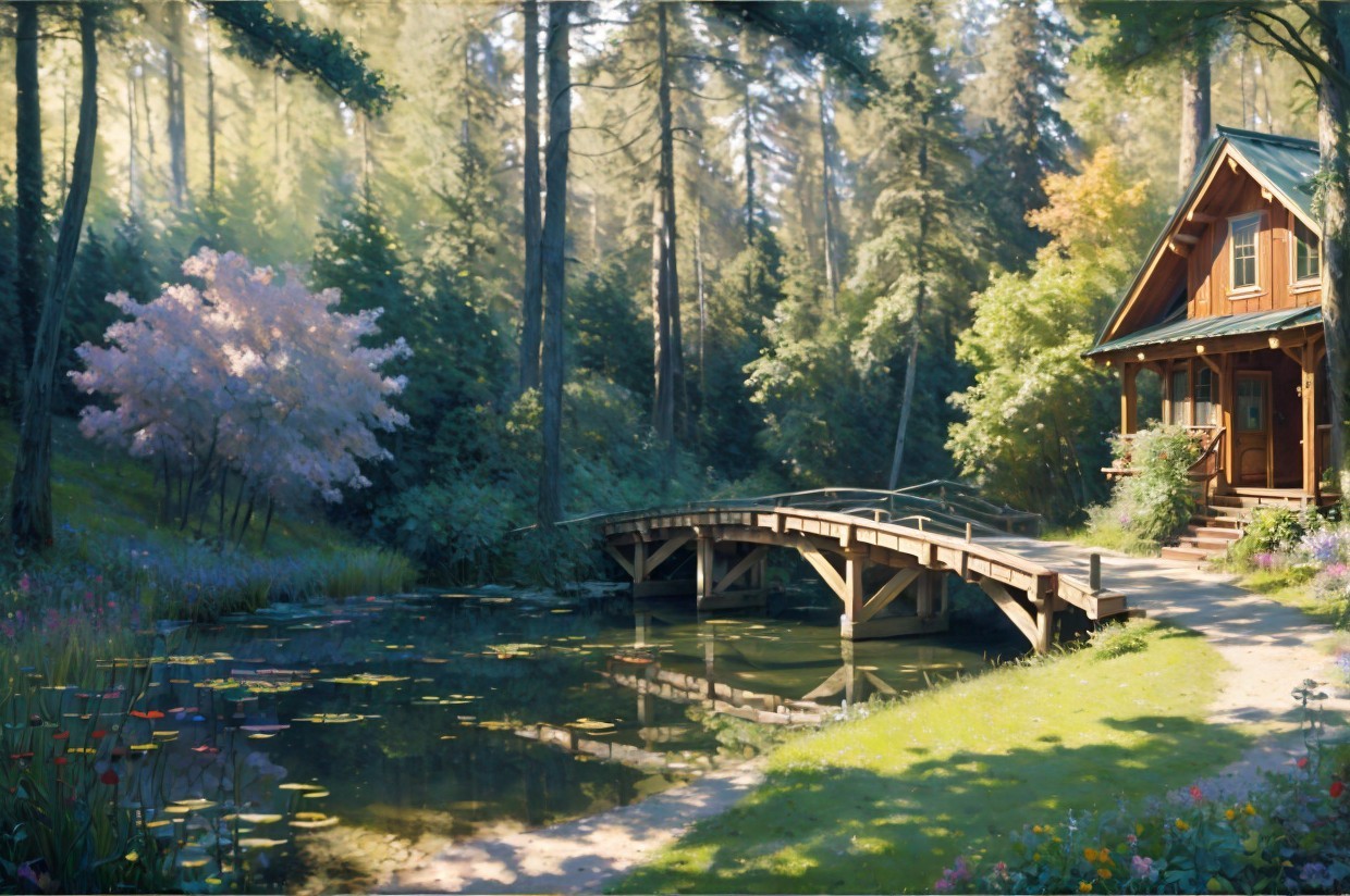A serene woodland scene with a rustic cabin beside a pond, connected by a wooden bridge, surrounded by lush trees and sunlight filtering through.