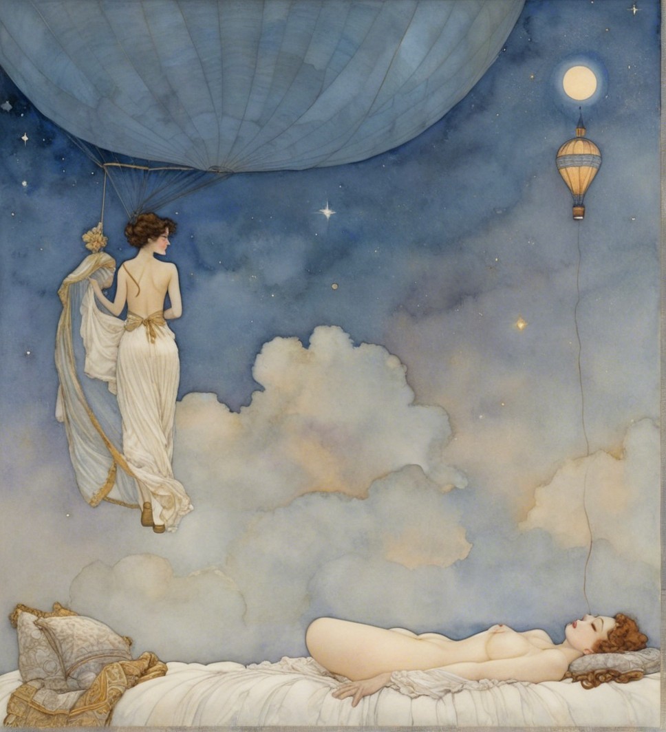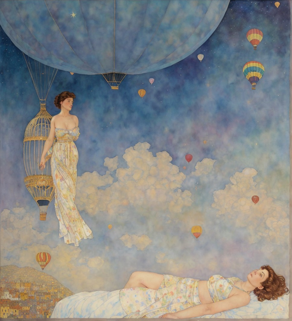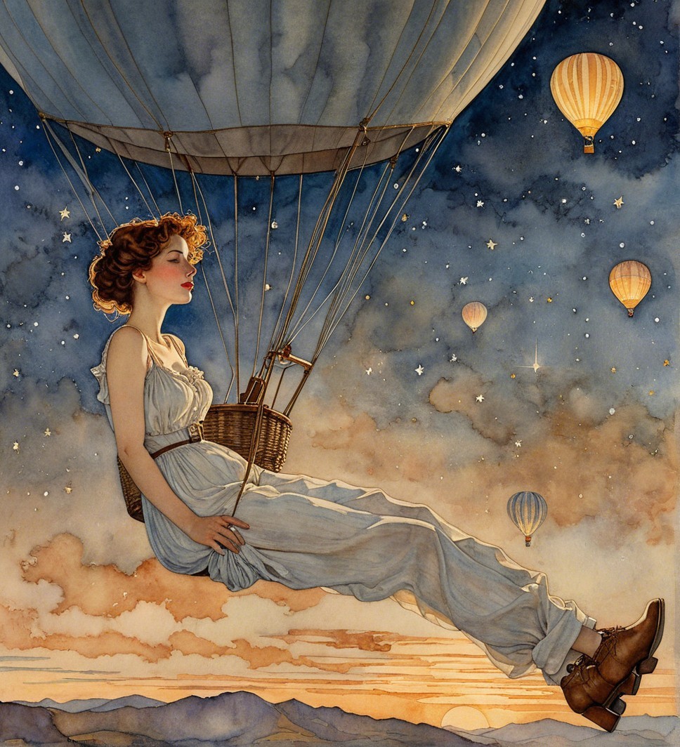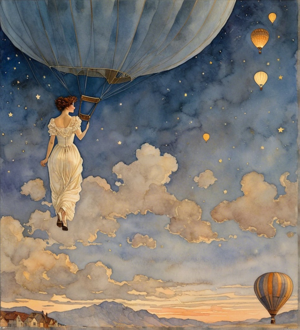 A serene scene of a woman in a flowing dress, gently suspended in a hot air balloon. She gazes dreamily at a beautiful sunset, surrounded by colorful balloons amidst a starry sky.