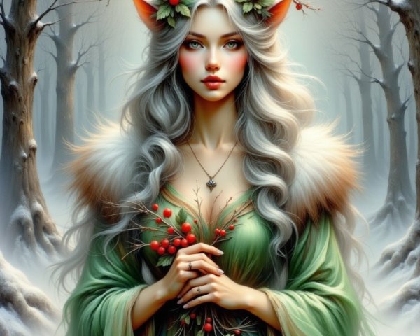 A happy corgi wearing a bright yellow dress adorned with daisies sits in a sunlit meadow, playfully holding a dandelion in its mouth, surrounded by floating seeds and vibrant greenery.