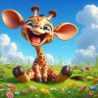 A cheerful cartoon giraffe sits in a vibrant meadow filled with colorful flowers, under a bright blue sky with fluffy clouds. It has big eyes and a joyous smile, exuding happiness.