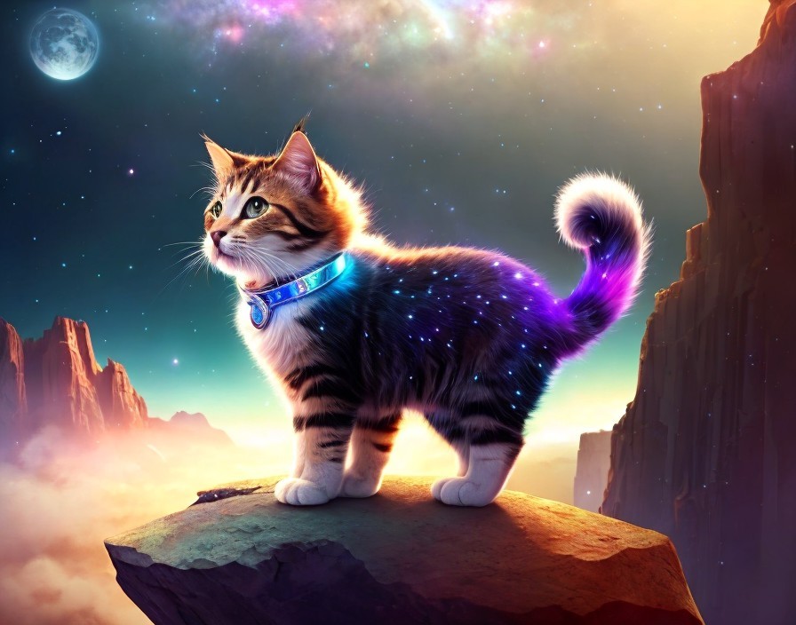 Calico Cat on Cliff with Starry Cosmic Backdrop