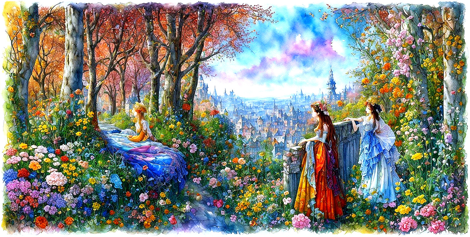 Colorful painting: Three women in period dresses near flower-lined path to fairy tale castle